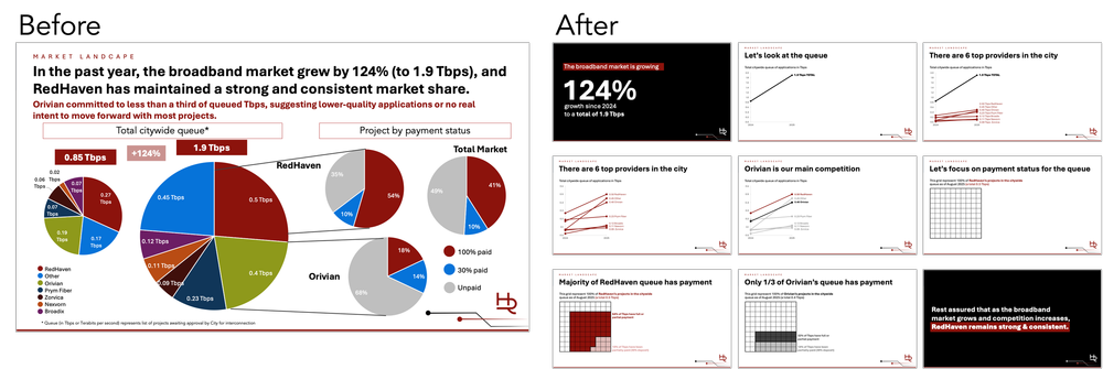 To demonstrate to the group that slide count and minutes do not necessarily go hand in hand, I redesigned the data story using the same information. My version used nine slides and could be discussed in two minutes. I also had more space, so I explored other chart types, such as slope graphs and square area charts.