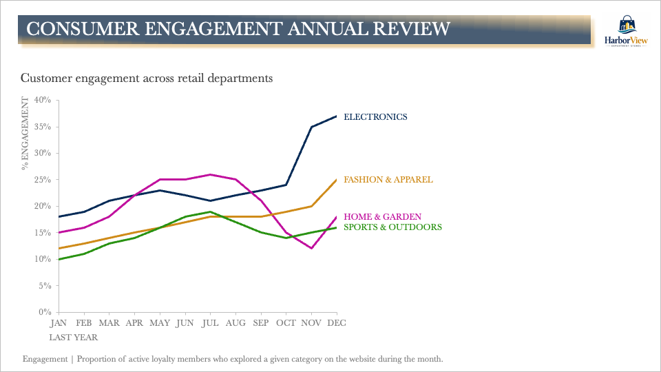 With the title “CONSUMER ENGAGEMENT ANNUAL REVIEW,” an opportunity is missed to indicate what truly matters with the slide, which shows customer engagement for a department store across several retail areas. The audience is left to determine independently what deserves attention. This can be improved by making a key observation about the data. Doing so primes the viewer to look for evidence of that statement in the chart.