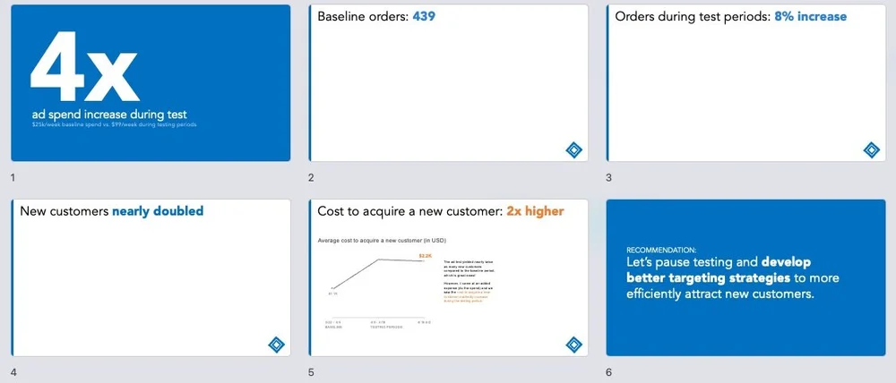 After refining the slide content and practicing the delivery, the final presentation for the ad spend results comes together. Here are the final slides and corresponding talking points:
