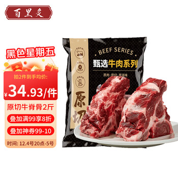 国产原切牛脊骨,含肉量20%左右,适合煲汤。目前百里炙京东自营旗舰店1kg售价¥39.9,满2件打8.8折,领取满99享8折券,叠加¥200-20黑五券,首购礼金减2元,下单2件,凑单1件,实付¥55.88包邮,折合¥13.97/斤好价!