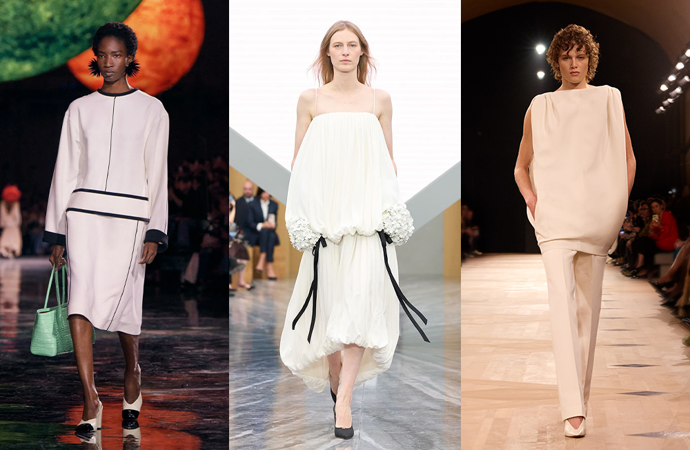 从 T 台上所体现的流行色角度来说,白色也在已发布的 2026 春夏有着足够的存在感,今年 9 月的 2026 春夏时装周十余家品牌都迎来了新创意总监的首秀,在 CHANEL、DIOR、Balenciaga 等重点品牌的秀场上都有相当比例的纯白造型,它们一面是对于各自品牌历史和风格的呼应,另一面也展现了重新开始的姿态——这与 PANTONE 选择“云上舞白”作为年度代表色的出发点异曲同工。