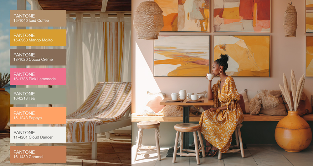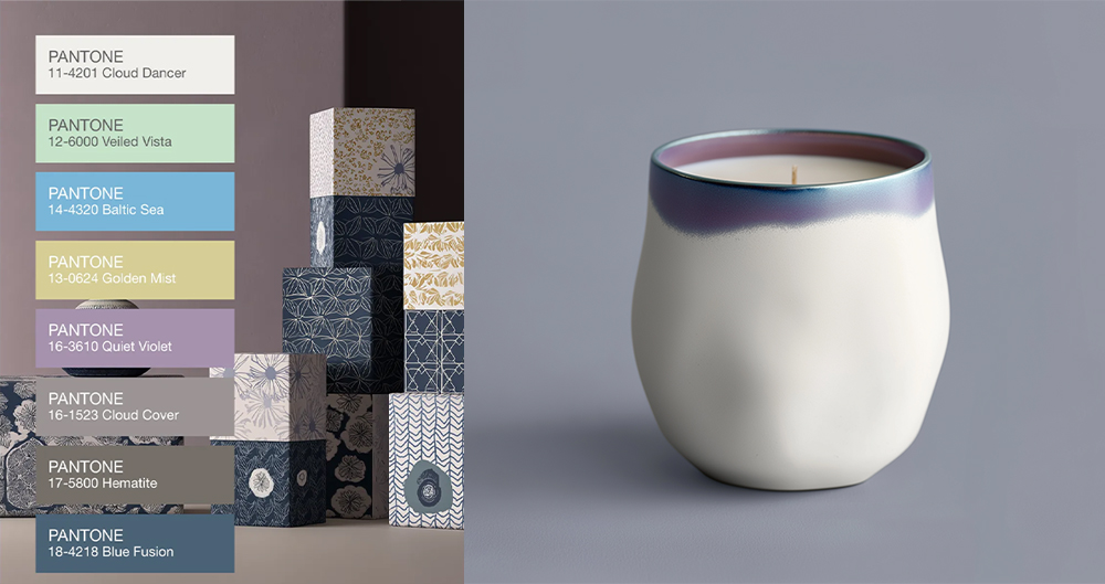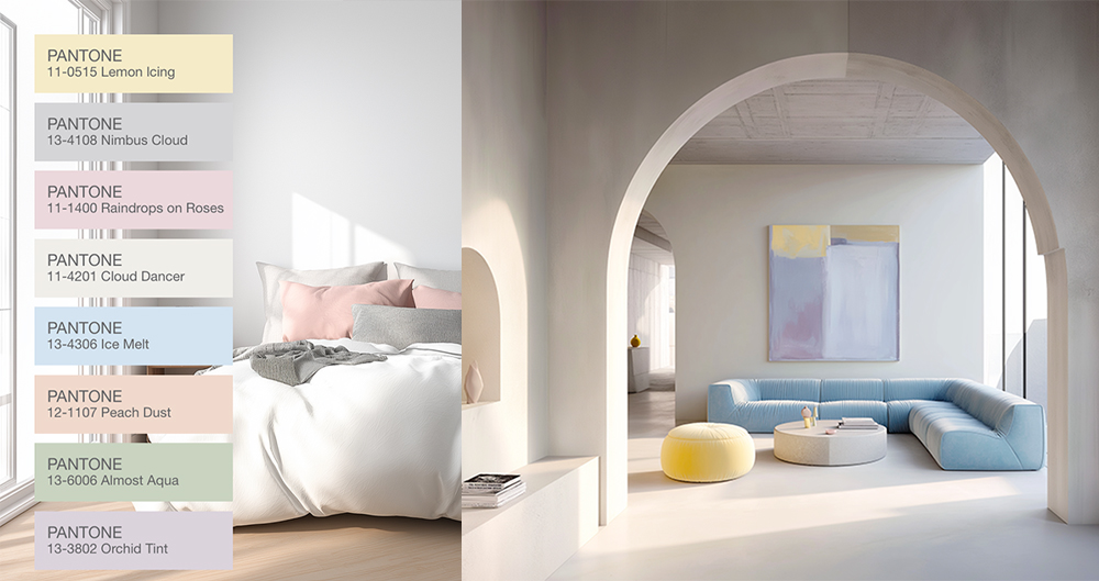 PANTONE 官方给到了 7 组推荐色盘——莫兰迪风格的“柔雾粉彩”、带有温暖治愈气息的暖橙色“片刻休憩”、呼应天空的蓝色系“氛围空境”、柔和大地系“舒适之域”、热情撞色的“热带绮调”、低饱和度的“光影叠韵”、沉郁复古的“魅光流熠”,在这些方案中“云上舞白”并不担当主角身份,而更多像是一个协调者,将多种色彩融合起来,并制作出呼吸感。