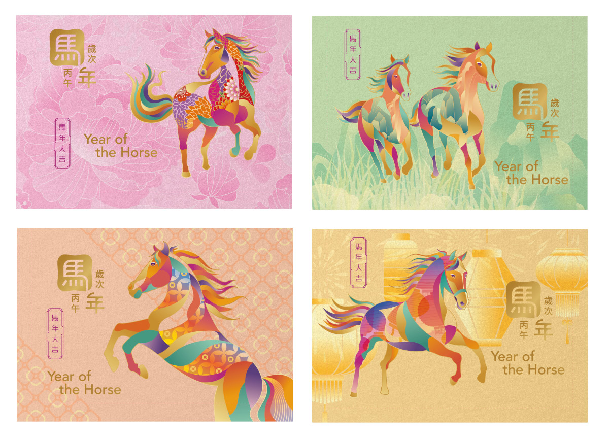 香港邮政带来的马年邮票 1 套 4 枚,这是香港地区贺岁生肖邮票第五辑的第三套,还是由黄镇康设计。邮票上体现了不同形态的骏马,它们以插画风呈现,马身上还带有吉祥纹样。虽然没用大红色,但也是喜气洋洋。