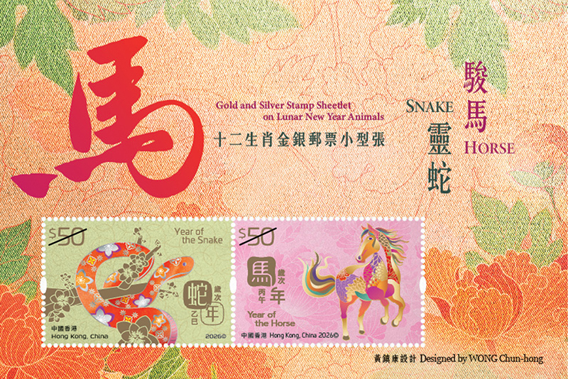 香港邮政还做了一个特别邮品,是象征辞旧迎新的“灵蛇骏马”小型张,它将即将过去的蛇年和即将到来的马年的生肖邮票做到了一起,一般很少看到这么做的。它还用了 22K 金箔以及银箔烫压,规格还是很高。