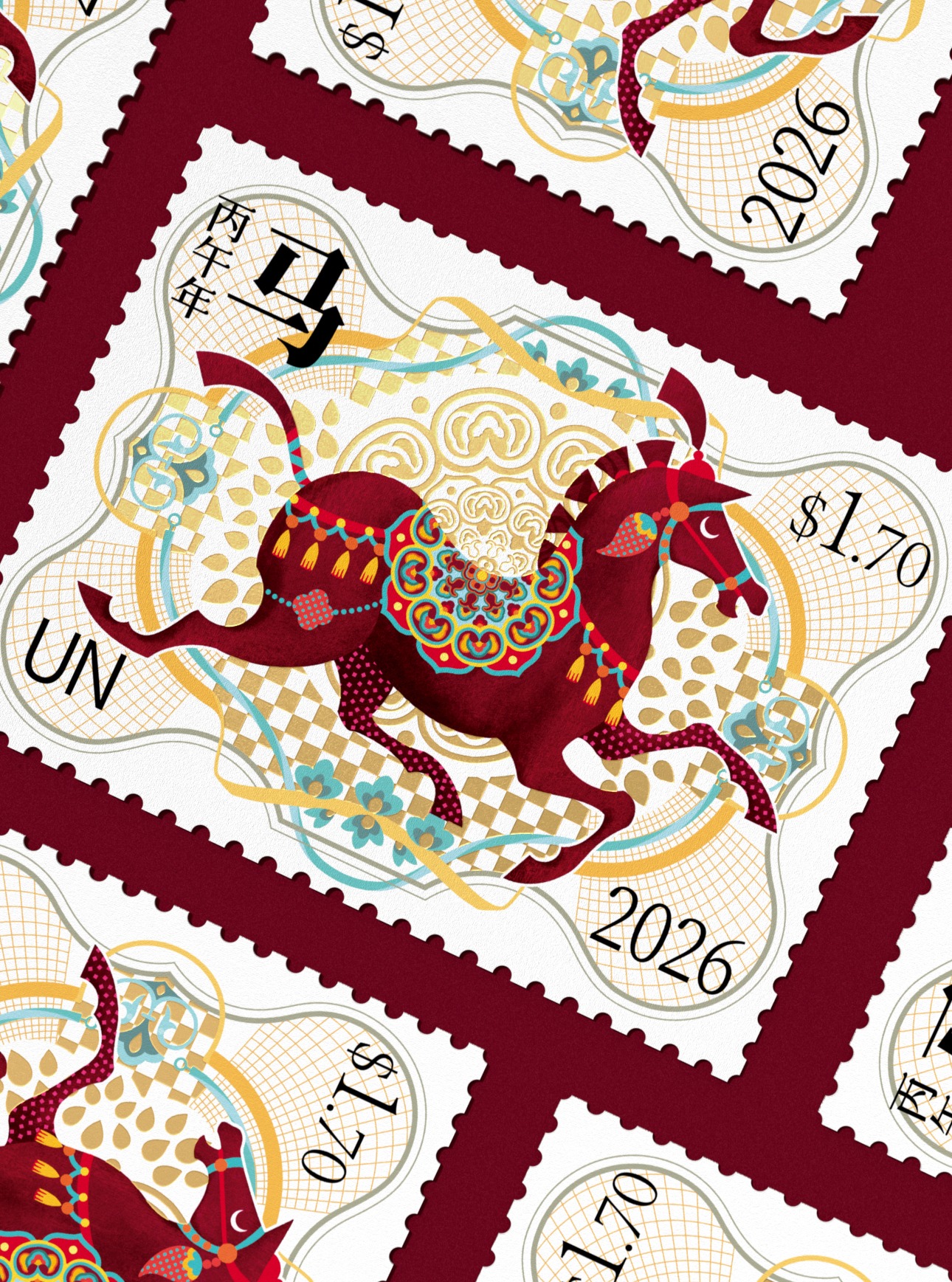 其它国家和机构的生肖票方面,11 月 19 日,联合国邮政管理局(UNPA)公布了马年生肖邮票,它将在 2026 年 1 月 16 日正式发售。邮票仍然由潘虎设计,这已经是他操刀的第 6 枚联合国生肖邮票。