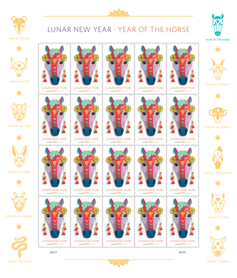 从 2020 年美国邮政总局(United States Postal Service,缩写 USPS)开始发行第三轮生肖票,这次的马年邮票是其中第 7 枚。它继续由美国邮政总局艺术总监 Antonio Alcalá 操刀,基于艺术家 Camille Chew 创作的十二生肖剪纸面具,由摄影师 Sally Andersen-Bruce 拍摄,并最终以融合了东西方艺术、传统与现代的方式完成。