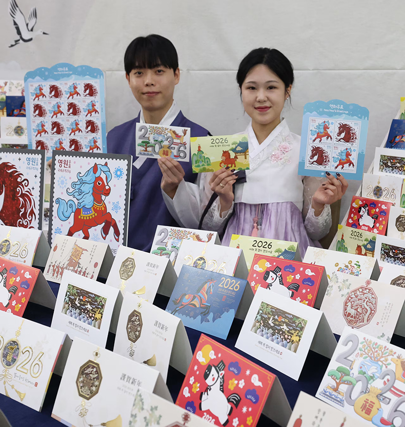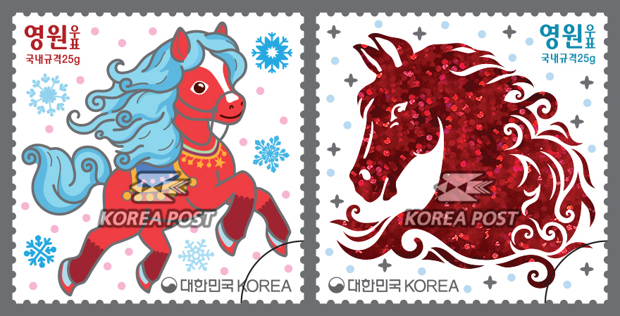 在韩国,韩国邮政事业本部在刚过去的 12 月 1 日发行了《丙午年》生肖邮票,1 套 2 枚,面值 430 韩元(约合人民币 2 元)。它们的设计诠释了“红马年”的概念,同时体现了韩文“贺年邮票”字样。