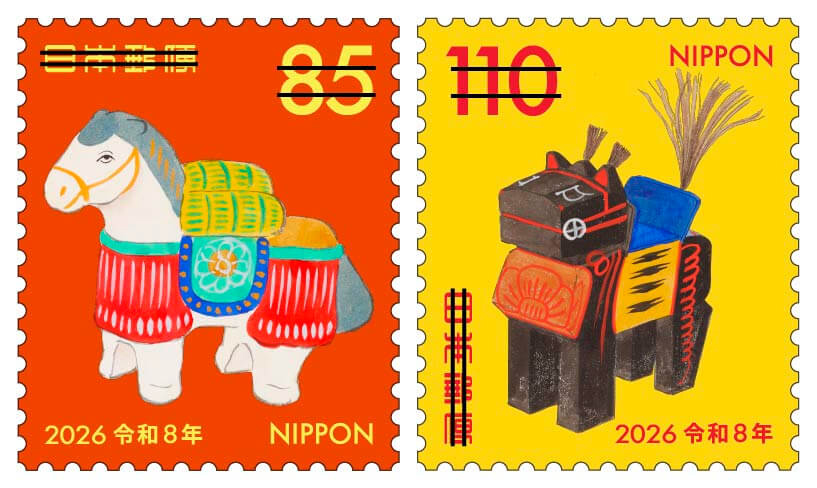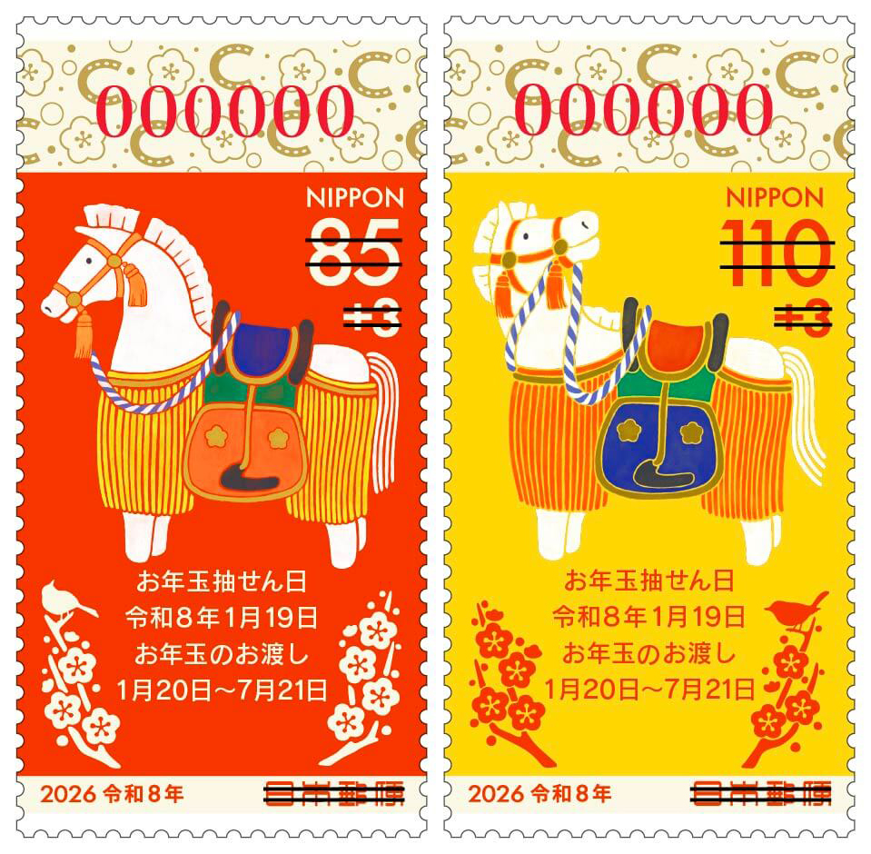 日本的马年邮票则早在今年 10 月 30 日就发行了,它 1 套 4 枚,面值分别是 85、110、85+3 和 110+3 日元(“+3”这个是附捐邮票,指的是不算作邮资内,这笔钱收起来是捐给需要支持的机构和组织用的)。