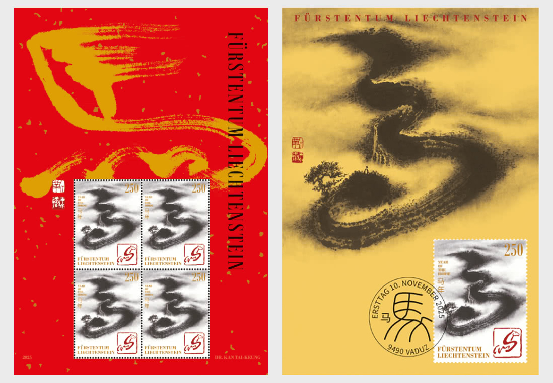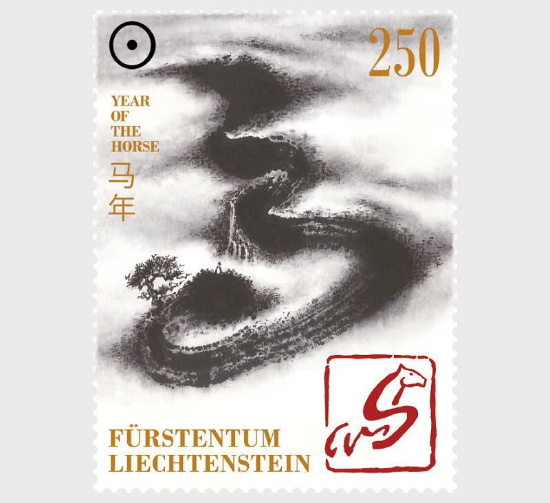 还有列支敦士登的生肖票,是今年 11 月 10 日公布的,设计由靳埭强操刀,希望体现马所象征的自由、勇气和独立,最终这一枚邮票融合了书法、绘画和篆刻,官方表示“体现了当代中国美学的最高境界”。