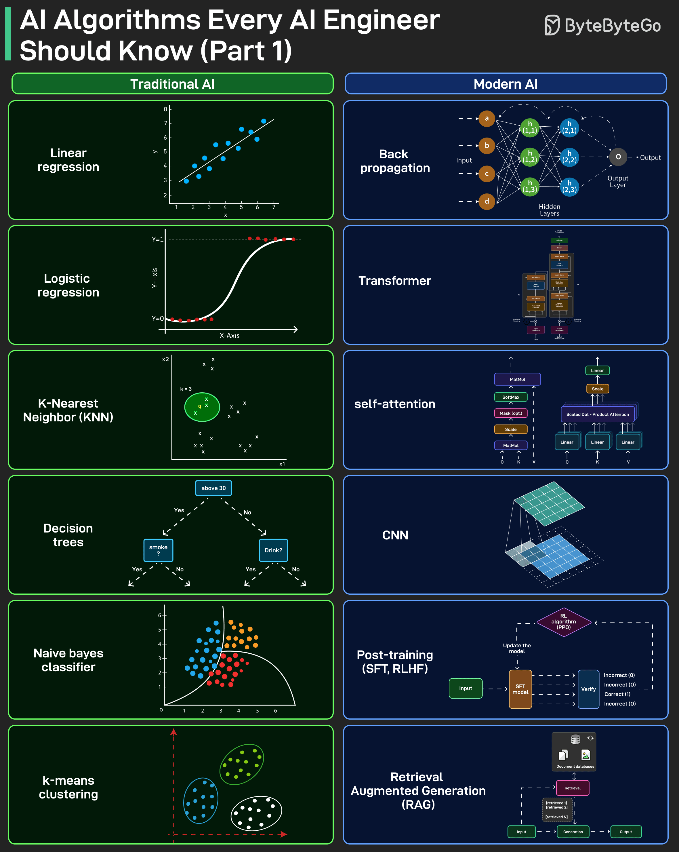 AI interviews often test fundamentals, not tools. This visual splits them into two buckets that show up repeatedly: Traditional AI and Modern AI.
