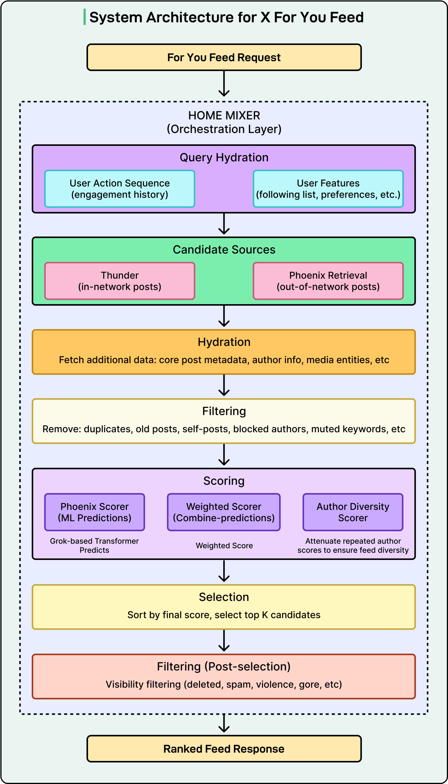 Home Mixer is the orchestration layer. It acts as the coordinator that calls the other components in the right order and assembles the final feed. It is not doing the heavy ML work itself, but just managing the pipeline.