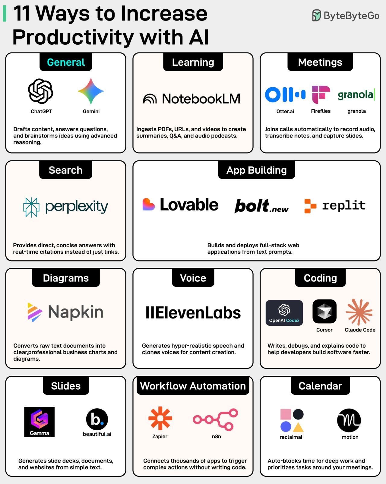 Here is a list of 19 tools that can speed up your daily workflow across different areas. Save this for the next time you feel stuck getting started.