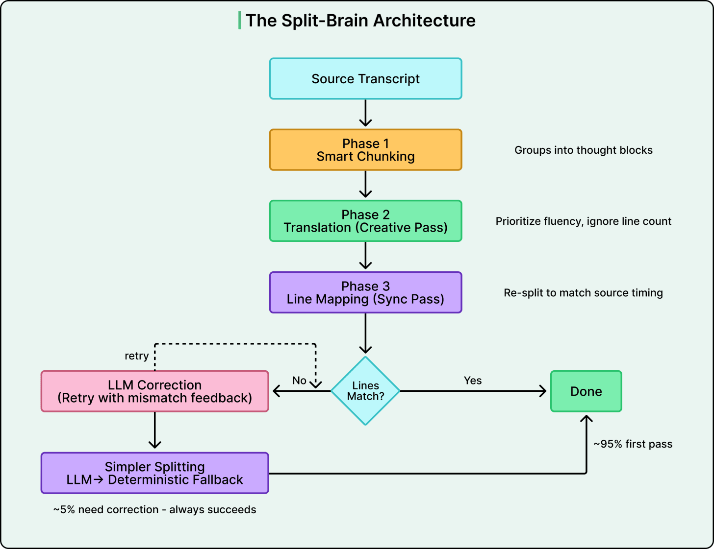 By separating these concerns, each pass gets to do its job without compromise. Phase 2 ensures the translation is grammatically sound. Phase 3 ensures the timing is respected. And on the first pass through this pipeline, roughly 95% of chunks map perfectly.
