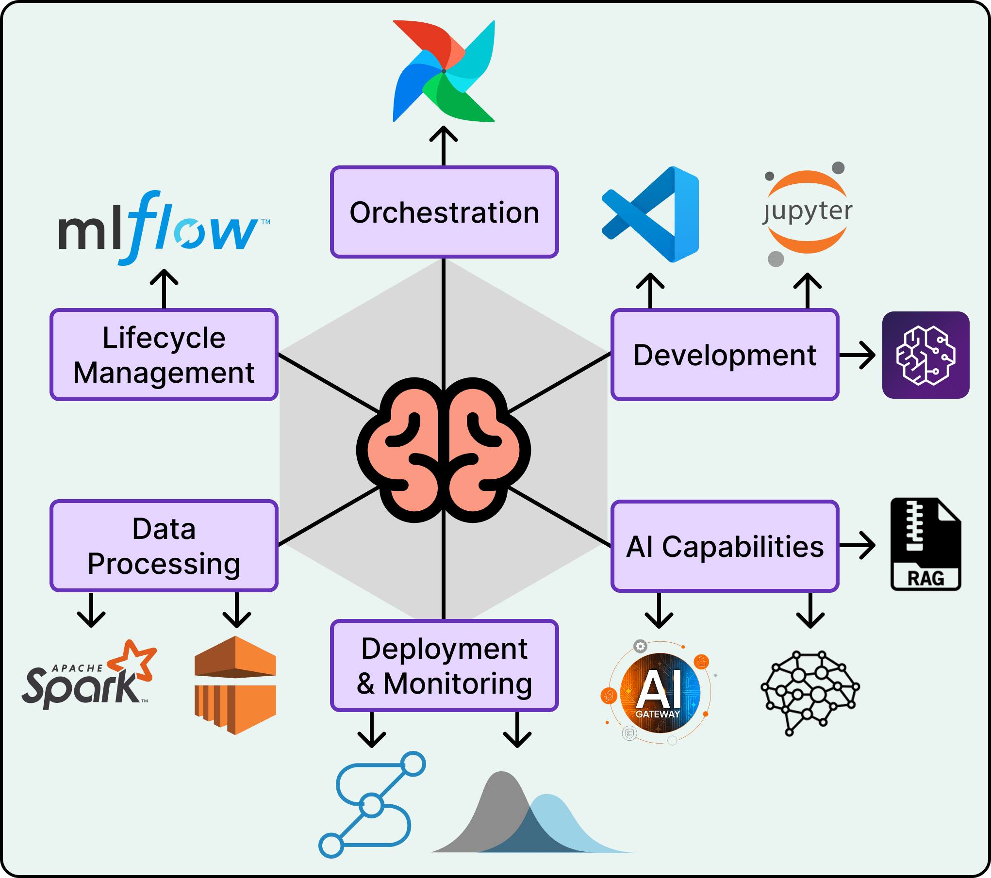 At the data layer, shared pipelines and governance tools standardize how information flows.