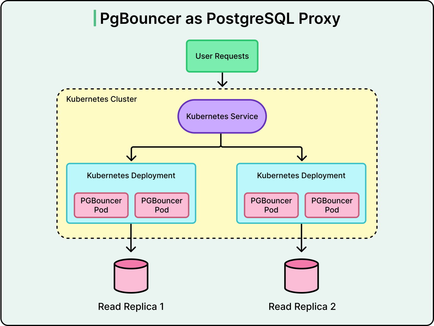 Each read replica has its Kubernetes deployment running multiple PgBouncer pods. Multiple deployments sit behind a single Kubernetes Service that load-balances traffic across pods. OpenAI co-locates the proxy, application clients, and database replicas in the same geographic region to minimize network latency and connection overhead.