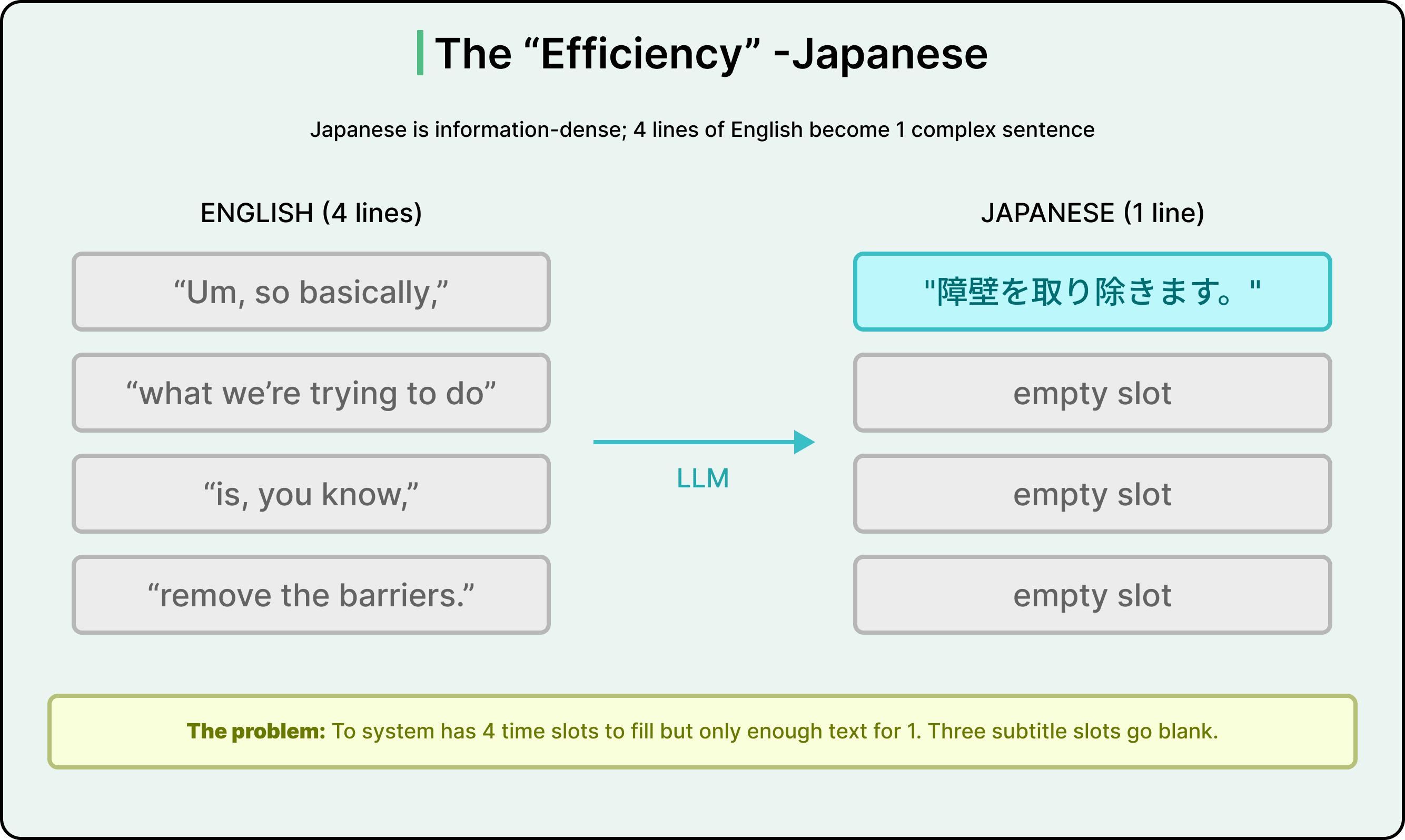 That maps to two timed subtitle slots on the video timeline. A traditional translation system handles each line separately, one-to-one. But the LLM recognizes this as a single, fragmented thought and produces one clean Japanese sentence, which is grammatically perfect and semantically accurate. But now the system has two time slots and only one line of text. The second slot goes blank, which means that the subtitles disappear while the speaker keeps talking.