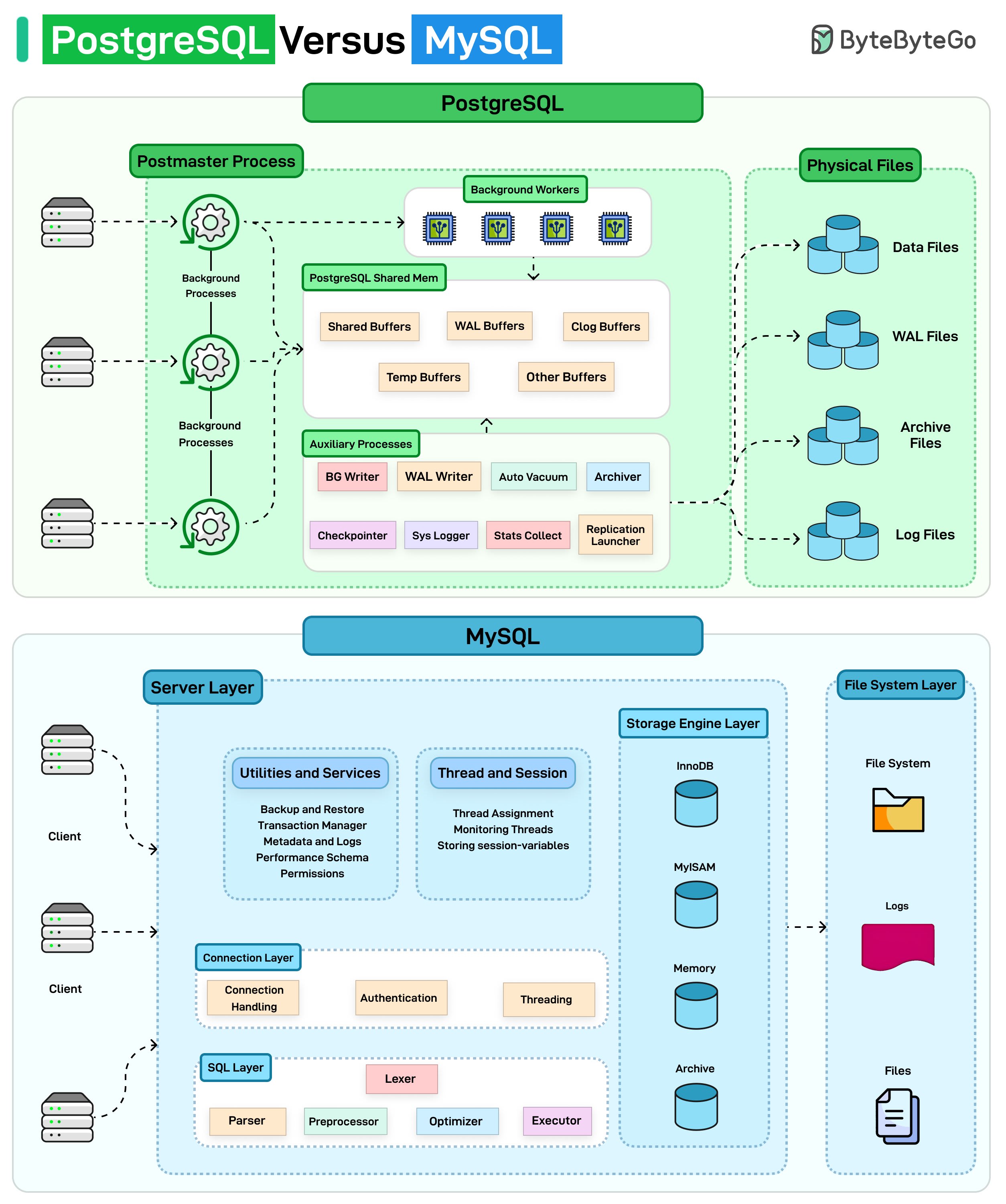 You can think of it like a factory with a manager (Postmaster) coordinating specialized workers. Each connection gets its own process and shares a common memory pool. Background workers handle tasks like writing data, vacuuming, and logging independently.