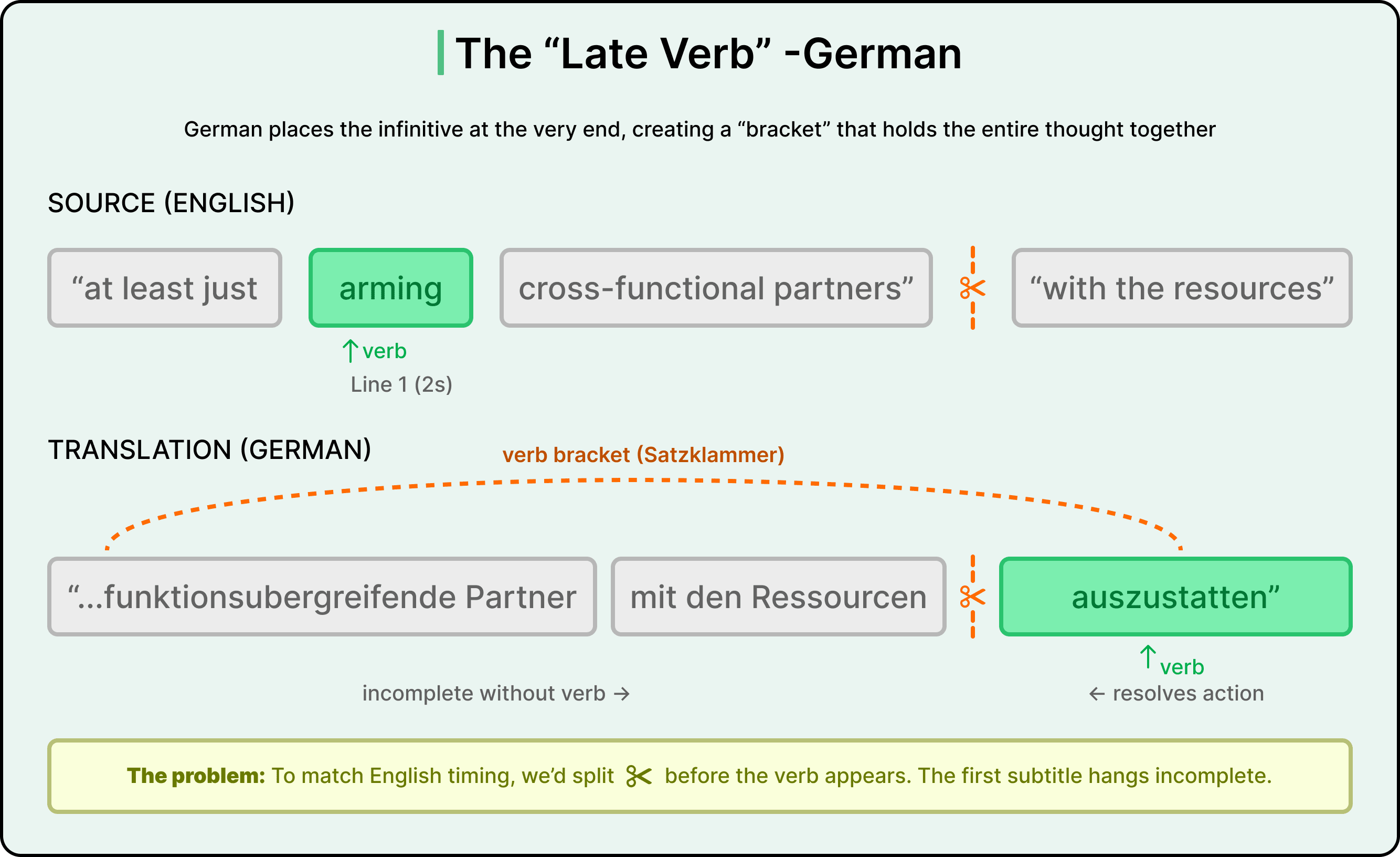 The German language has a different problem. German places verbs at the end of clauses, creating what linguists call a “verb bracket.” If the subtitle system tries to split a German sentence at a line boundary, the first subtitle hangs grammatically incomplete, missing its verb. The LLM resists producing this because it looks like a syntax error.
