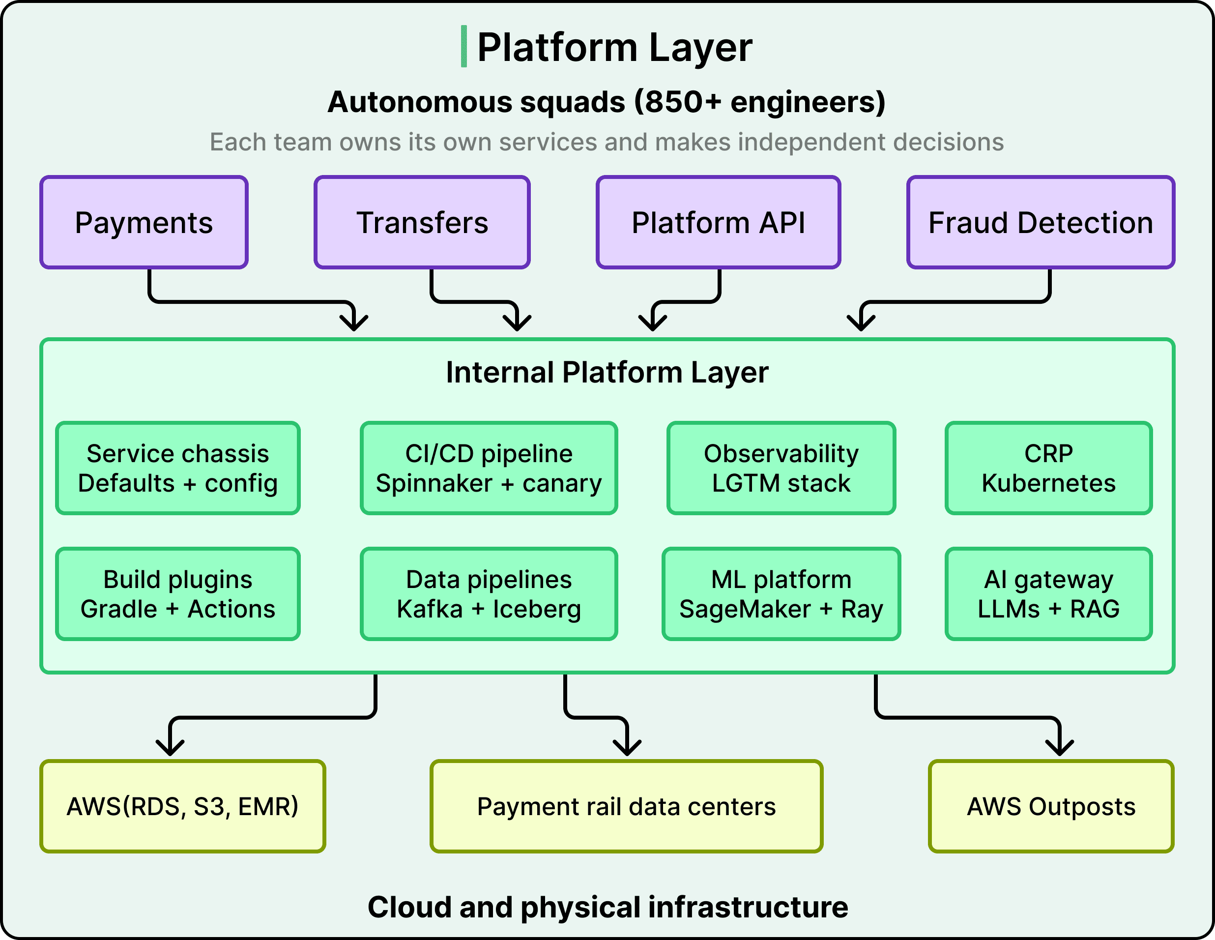 The boundary between the platform team and domain teams also requires ongoing negotiation. DoorDash addresses this through published platform principles, versioned interface contracts, and joint KPIs that create shared accountability. Domain expert teams own their business logic (fraud detection, compliance, payments) while the platform enforces consistency. This is a human coordination challenge that architecture alone doesn’t solve.