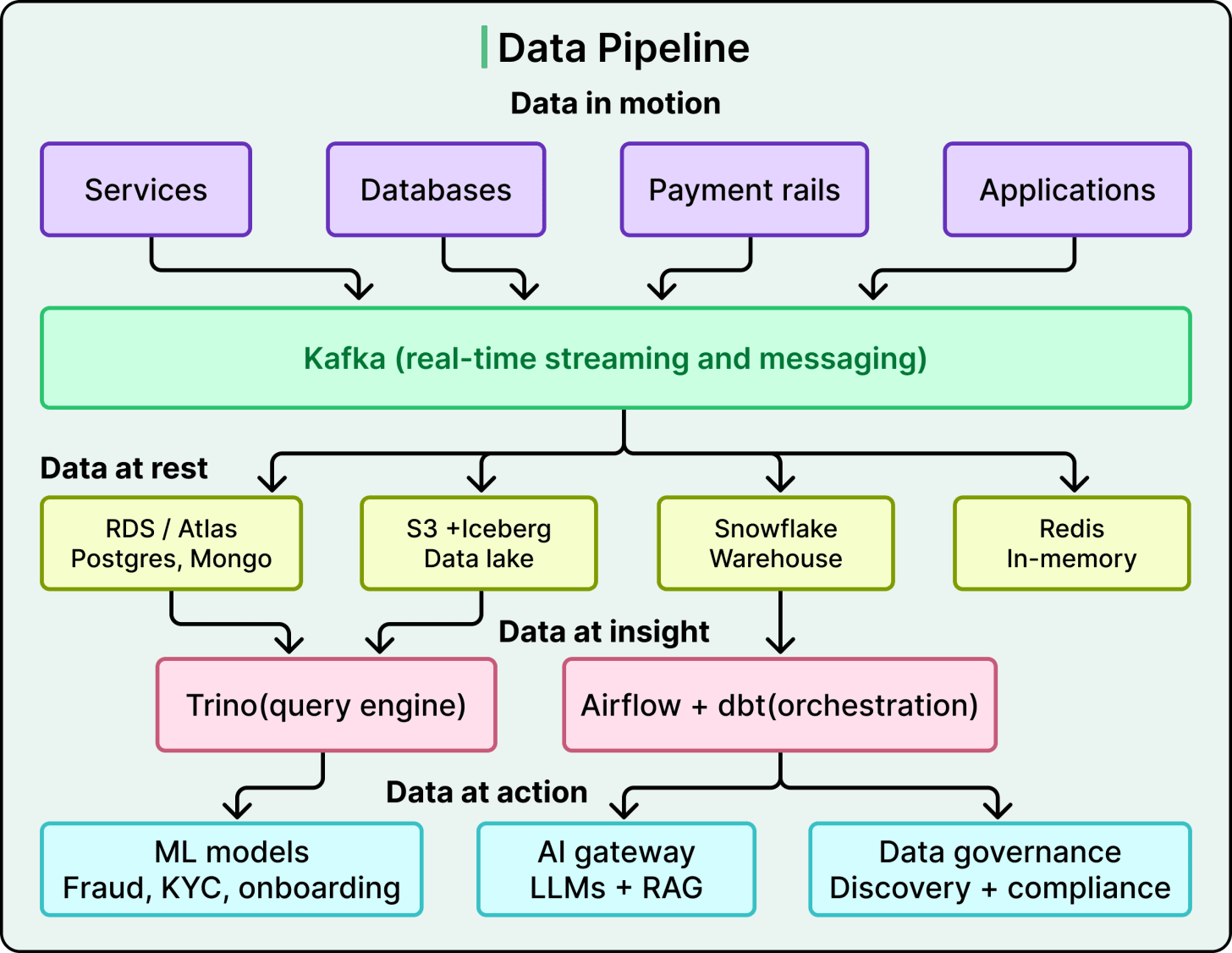 All of this money movement generates enormous volumes of data. Wise’s data architecture is built as a pipeline from movement to insight to action, with each layer feeding the next.