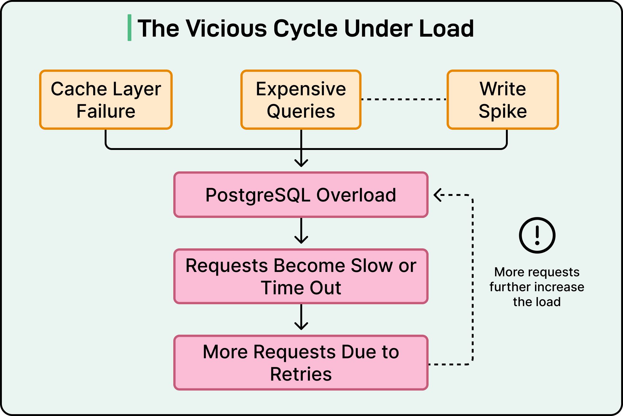 However, when cache hit rates drop unexpectedly, the burst of cache misses can push massive request volumes directly to PostgreSQL. In other words, an upstream issue causes a sudden spike in database load. This could be widespread cache misses from a caching layer failure, expensive multi-way joins saturating the CPU, or a write storm from a new feature launch.