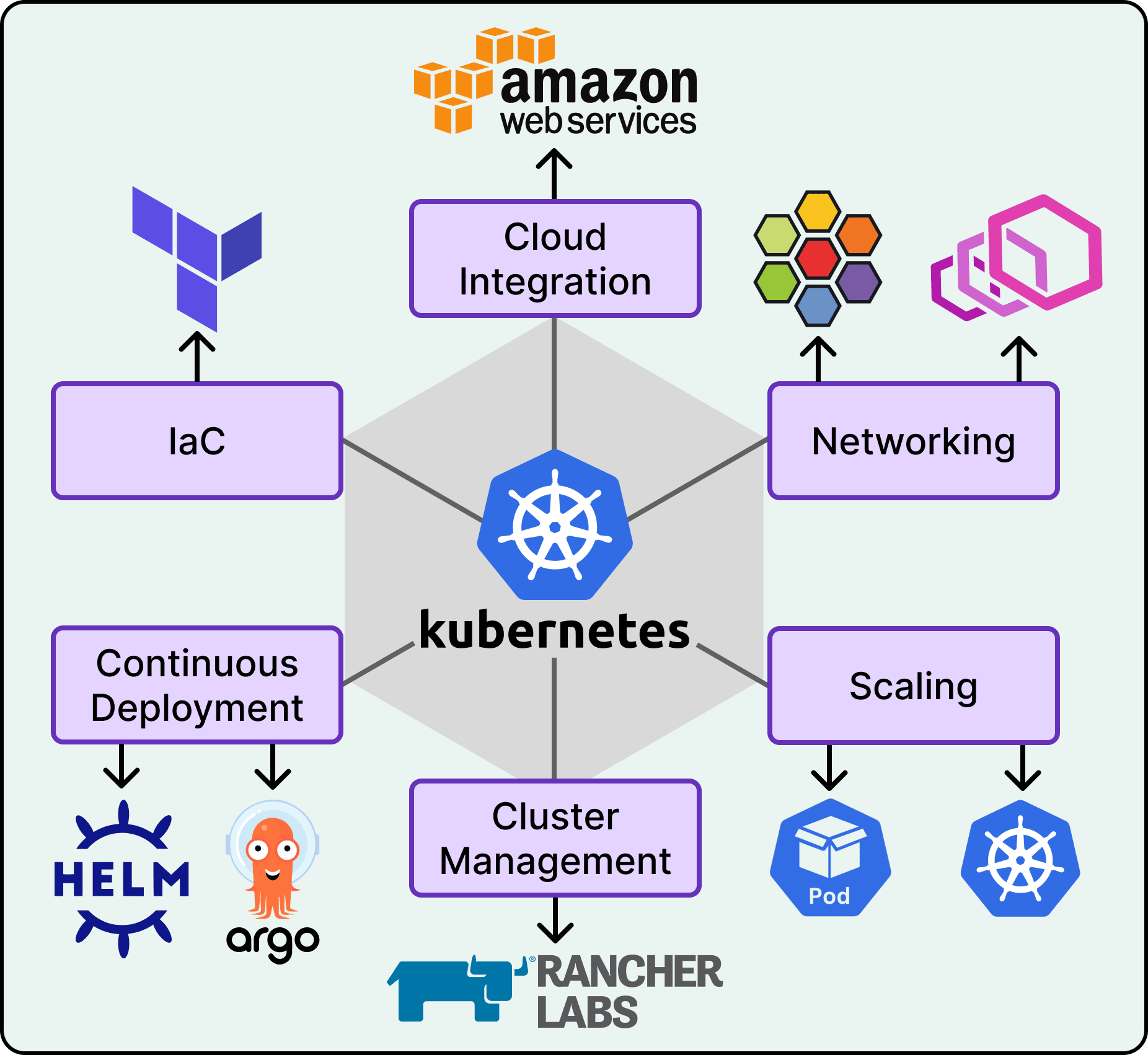 At the infrastructure layer, CRP and Kubernetes absorb the complexity of hosting services.