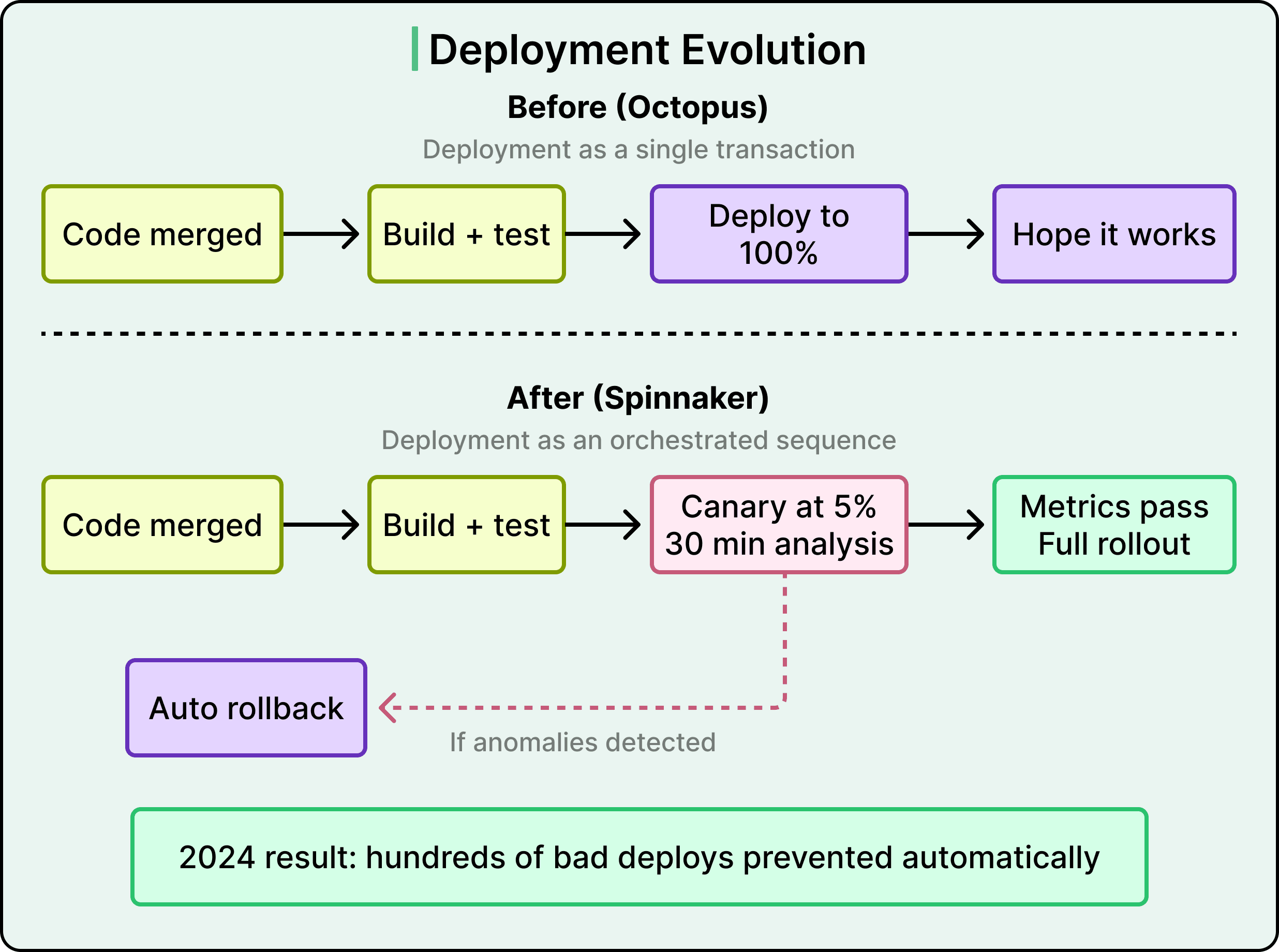 There was no human intervention, but the system routed just 5% of traffic to the new version, watched technical and business metrics for 30 minutes, and rolled back when it detected anomalies. Three years earlier, Wise was deploying with a simpler in-house tool that treated each release as a basic transaction, where the process was essentially to push the code and hope for the best.