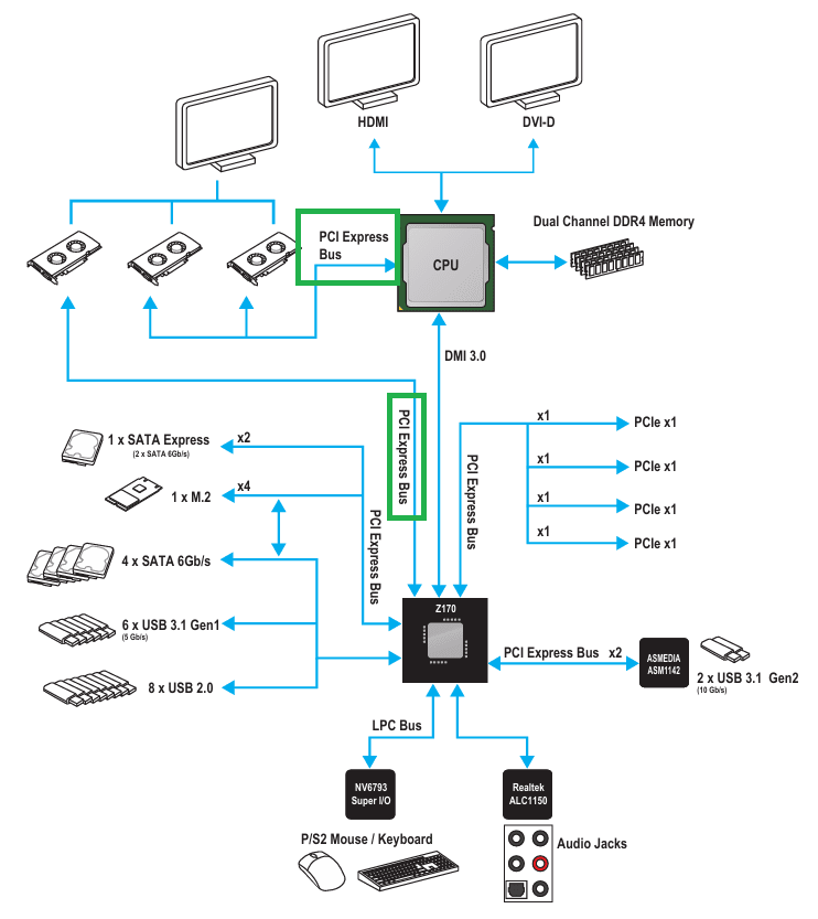 Skylake’s Z170 chipset uses a familiar southbridge-only topology like Z890, but with less connectivity and lower bandwidth. I’m testing on the MSI Z170 Gaming Pro Carbon, which connects the top PCIe x16 slot to the CPU. A middle slot also connects to the CPU to allow splitting the CPU’s 16 PCIe lanes into two sets of eight. The bottom slot connects to the PCH.