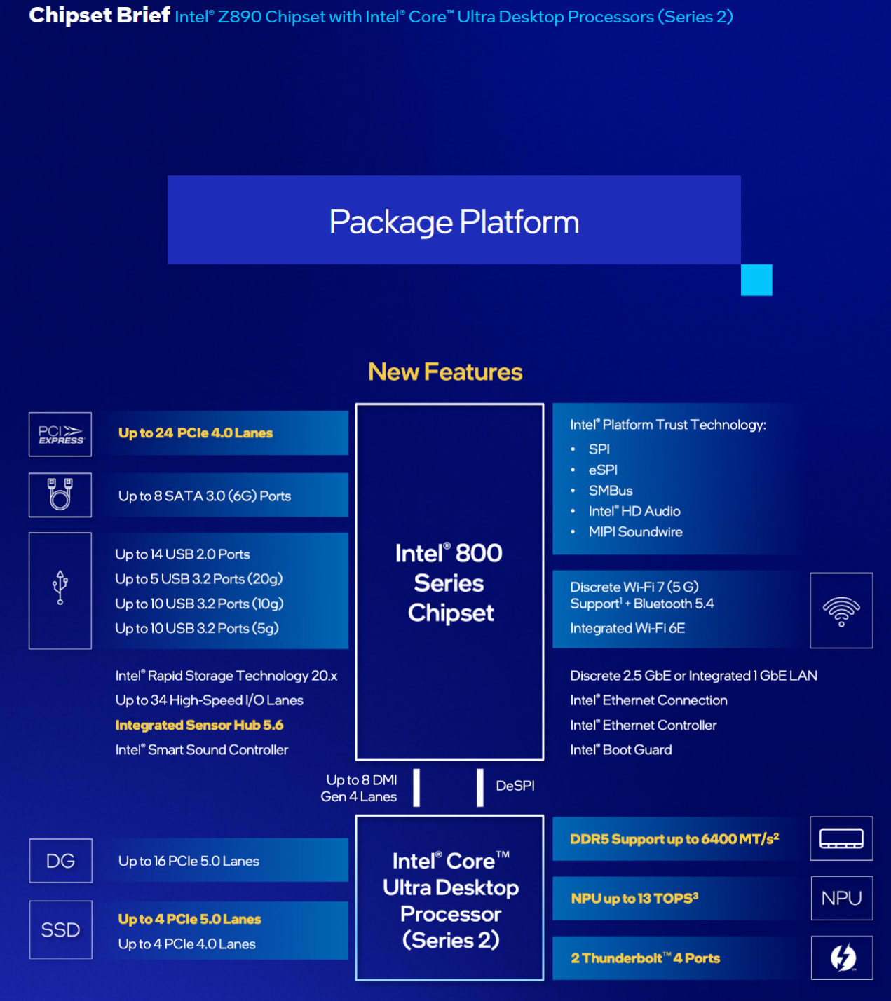 Arrow Lake chipsets follow the same topology as Intel chipsets going back to Sandy Bridge. A Platform Controller Hub (PCH) serves the southbridge role. The PCH connects to the CPU via a Direct Media Interface (DMI), which is a PCIe-like interface. Z890 uses DMI Gen 4, which can use transfer speeds of up to 16 GT/s with eight lanes. I’m testing on the MSI PRO Z890-A WIFI, which provides three PCIe slots. The first is a x16 slot connected to the CPU, while the two others are x4 slots connected to the PCH.