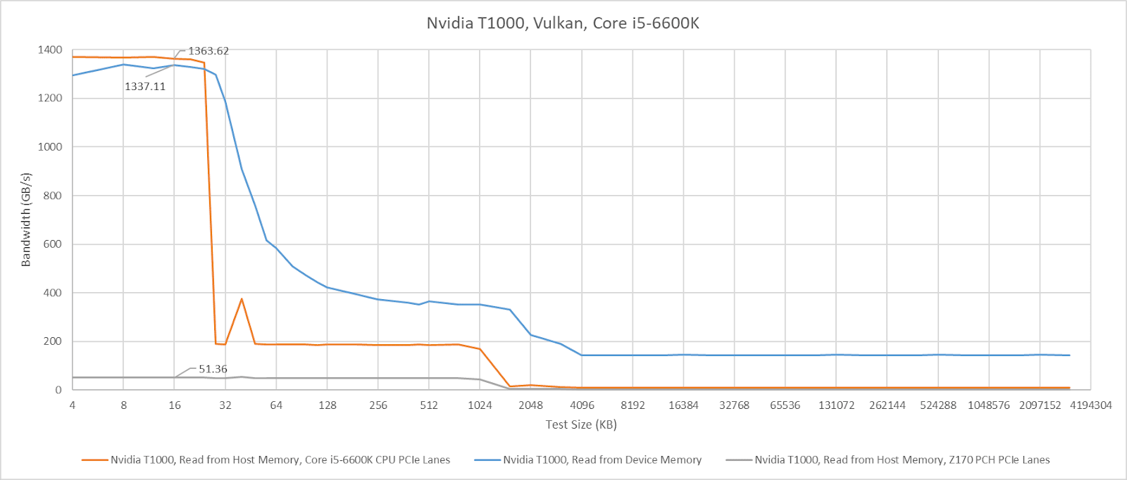 L1 bandwidth on the T1000 isn’t affected when the GPU is attached to CPU PCIe lanes, though L2 hit bandwidth is strangely lower (though still well above VRAM bandwidth). Switching the card to the Z170’s PCH lanes reduces cache hit bandwidth to just over 51 GB/s.