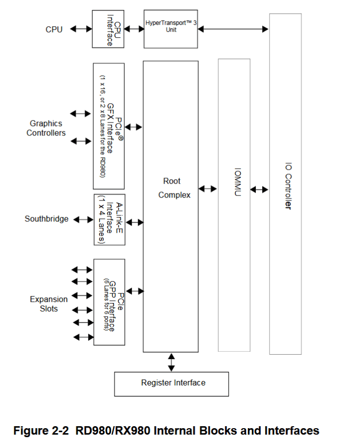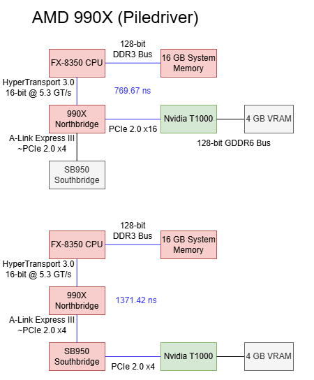 AMD’s Bulldozer and Piledriver chipsets use an older setup where the CPU has an integrated memory controller, but the chipset is still responsible for all PCIe connectivity. I’m testing on the ASUS M5A99X EVO R2.0, which implements the 990X chipset. The RD980 (990X) northbridge connects to the CPU via a 5.3 GT/s HyperTransport link, which I assume is running in 16-bit wide “ganged” mode. Two PCIe slots on the M5A99X connect to the RD980, and can run in either single x16 or 2x8 mode. A x4 A-Link Express III interface connects the northbridge to the SB950 southbridge, which provides more PCIe lanes and slower IO. A-Link Express is based on PCIe Gen 2, and runs at 5 GT/s.