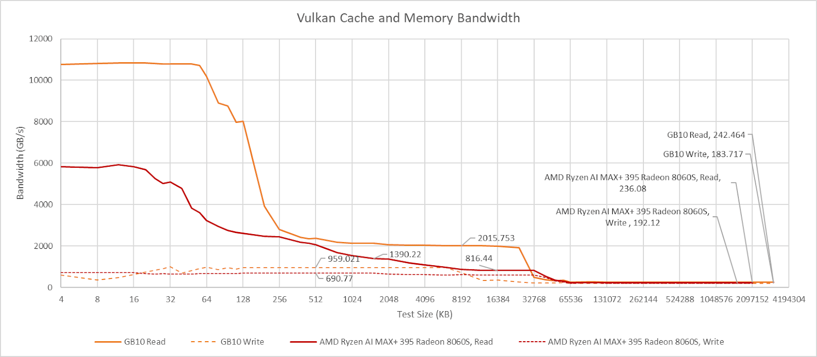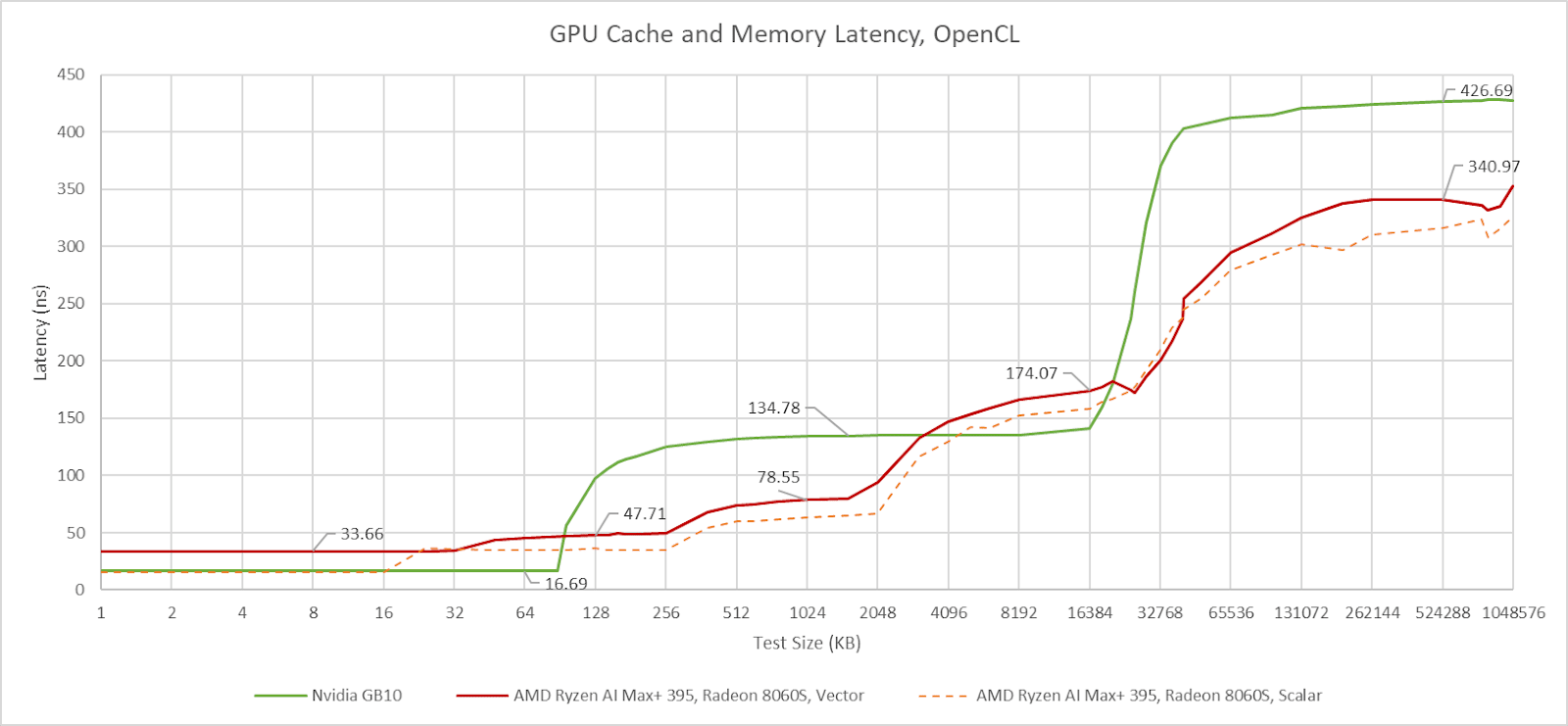 GB10’s GPU-side memory subsystem brings few surprises. It’s basically a Blackwell GPU integrated, with a familiar two-level caching setup. The L2 serves as both a high capacity last level cache and the first stop for L1 misses. AMD in contrast uses more cache levels and gradually increasing cache capacity at each level, which mirrors their discrete GPUs too. In a cache and memory latency test, GB10 and Strix Halo trade blows depending on test size. Larger caches are hard to optimize for high performance, so AMD wins when it’s able to hit in its smaller 256 KB L1 or 2 MB L2 compared to Nvidia’s higher latency 24 MB L2. Nvidia wins when GB10 can keep accesses within L2 while AMD has to service them out of Strix Halo’s 32 MB memory side cache. Both Strix Halo and GB10 use LPDDR5X memory. Strix Halo’s iGPU enjoys better latency to LPDDR5X than Nvidia’s GB10, reversing the situation seen on the CPU side.