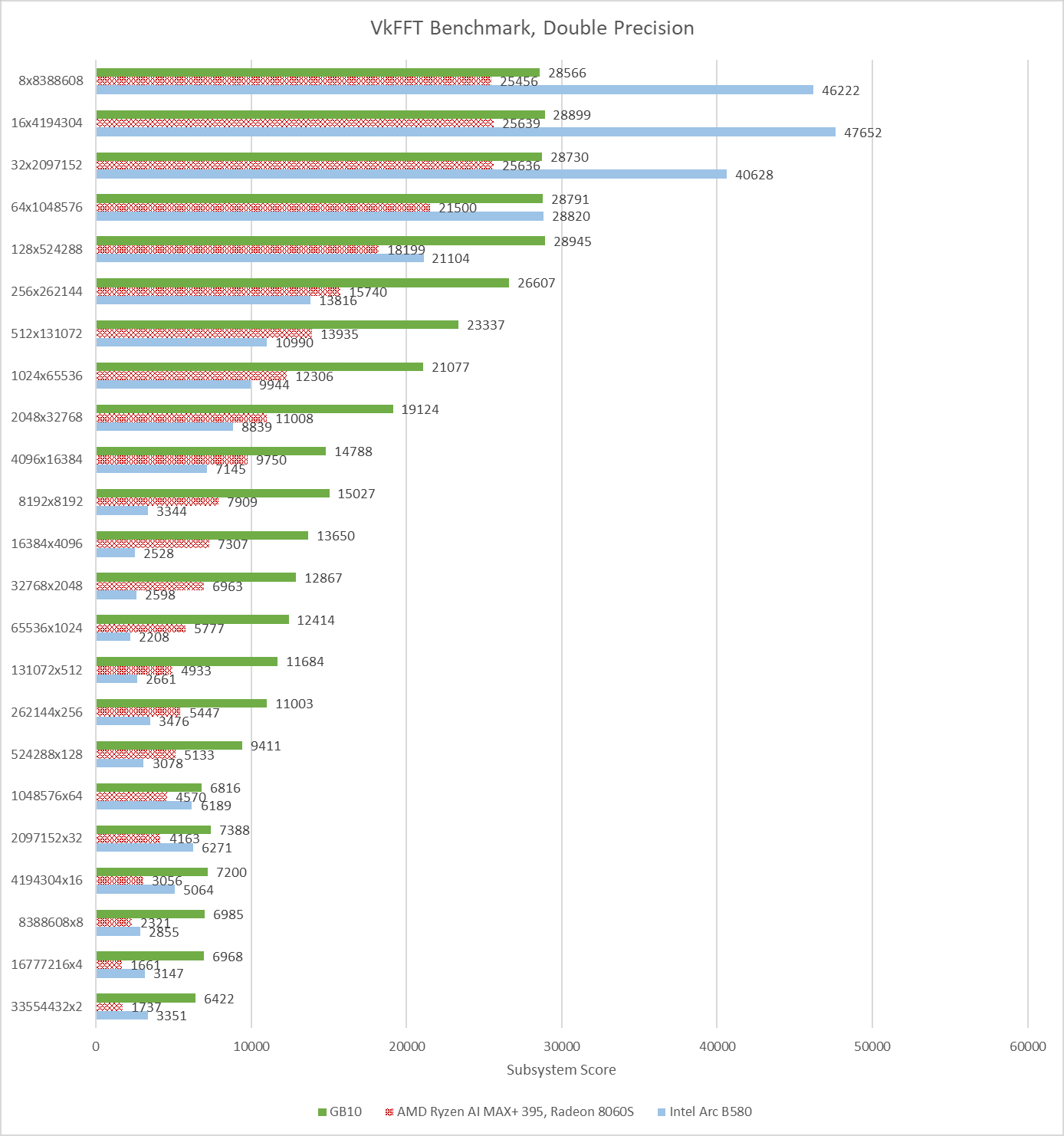VkFFT can also target double precision (FP64) and half precision (FP16). GB10 is able to take an overall lead with double precision, while Strix Halo still can’t pull ahead in any test. Intel’s B580 can use its bandwidth advantage to win in some configurations, but not enough to get an overall score lead. None of the three GPUs here have strong FP64 performance, but VkFFT is often memory bound. The primary challenge is feeding the execution units, not having more of them.