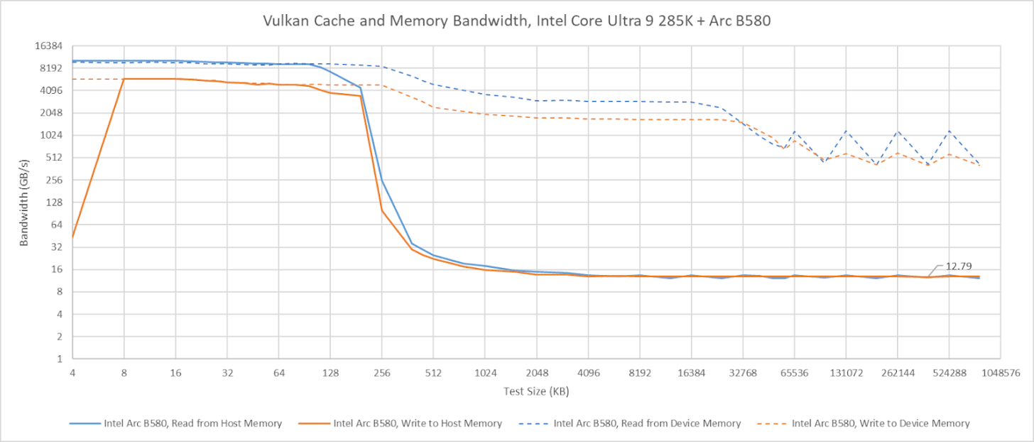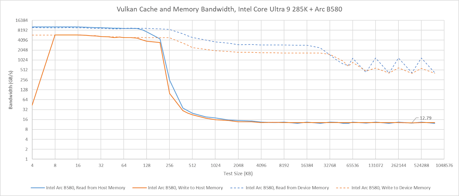 I’m going to skip commenting about the T1000’s cache hit bandwidth on Arrow Lake. It does not behave as expected, even when attached to the CPU’s PCIe lanes. The T1000’s cache hit behavior also differs from that of other GPUs. For example, Intel’s Arc B580 maintains full cache hit bandwidth when attached to the Arrow Lake platform, though curiously it can’t cache host memory in its L2.