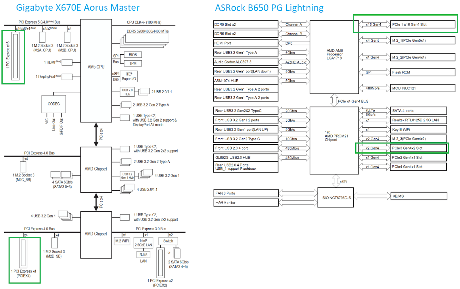 AMD’s latest desktop platform is built around the PROM21 chip. PROM21 has a PCIe 4.0 x4 uplink, and exposes a variety of downstream IO including more PCIe 4.0 links. AMD’s X670E chipset chains two PROM21 chips together, basically giving the platform two southbridge chips for better connectivity. Gigabyte’s X670E Aorus Master has three PCIe slots. One connects to the CPU, while the two others connect to the lower PROM21 chip. The PROM21 chip connected to the CPU isn’t hooked up to any PCIe slots. Instead, it’s only used to provide M.2 slots and some USB ports. The B650 chipset, tested here on the ASRock B650 PG Lightning, only uses one PROM21 chip and connects it to PCIe slots.