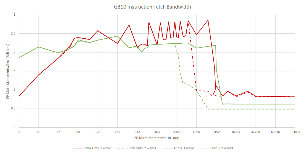 RDNA3.5 Workgroup Processors use a simpler instruction caching strategy, with one 32 KB instruction cache servicing four SIMDs. Bringing a second wave into play does not cause bandwidth contention at the L1I, though two waves executing different code sections do contend for L1I capacity. Running code from L2 leads to poor instruction throughput on both architectures.