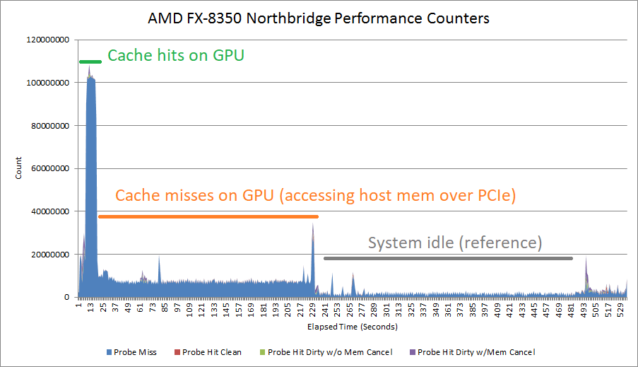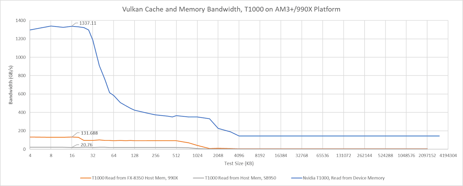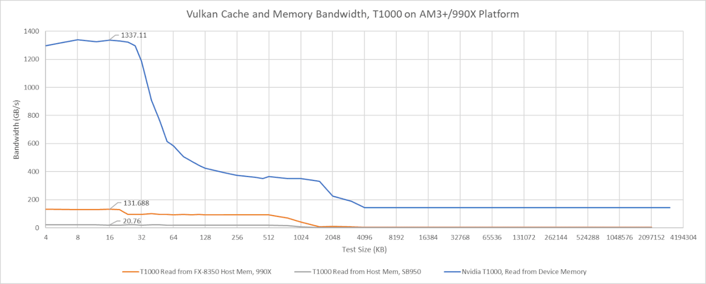 Setting the VK_MEMORY_PROPERTY_HOST_COHERENT_BIT means writes can be made visible between the CPU and GPU without explicit cache flush and invalidate commands. With the T1000, this has the strange side effect of causing a lot of probe traffic even when the GPU hits its own caches. GPU cache hit bandwidth can be constrained depending on platform configuration, possibly depending on probe throughput. AMD’s old Piledriver CPU has northbridge performance events that can track probe results. These events show a flood of probes when the test goes through small sizes that fit within the T1000’s caches. Probe activity dips when the test reaches larger sizes and bandwidth is constrained by the PCIe link.