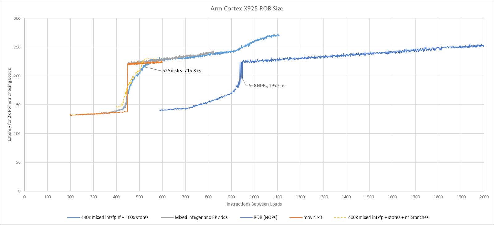 Because results with NOPs were inconclusive, I tried testing with combinations of various instructions designed to dodge other resource limits. Mixing instructions that write to the integer and floating point registers showed X925 could have a maximum of 448 renamed registers allocated across its register files. Recognized zeroing idioms like MOV r,0 do not allocate an integer register, but also run up against the 448 instruction limit. I tried mixing in predicate register writes, but those also share the 448 instruction limit. Adding in stores showed the core could have slightly more than 525 instructions in flight. Adding in not-taken branches did not increase reordering capacity further. Putting an exact number on X925’s reorder buffer capacity is therefore difficult, but it’s safe to say there’s a practical limitation of around 525 instructions in flight. That puts it in the same neighborhood as Intel’s Lion Cove (576) and ahead of AMD’s Zen 5 (448).