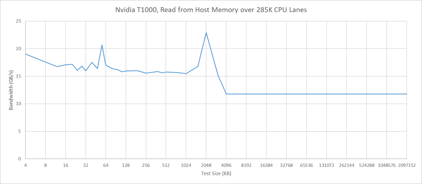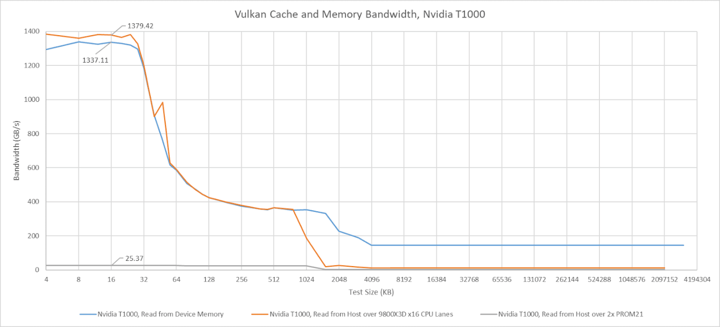Mysteries aside, I’ll be dropping a note when GPU cache hit bandwidth appears to be affected by the platform. But I won’t comment on GPU cache miss bandwidth, which will obviously be limited by PCIe bandwidth. The T1000 has a x16 PCIe Gen 3 interface to the host, and the newest platforms I test here can support PCIe Gen 4 or Gen 5. I don’t have a single slot card with PCIe Gen 4 or Gen 5 support.
