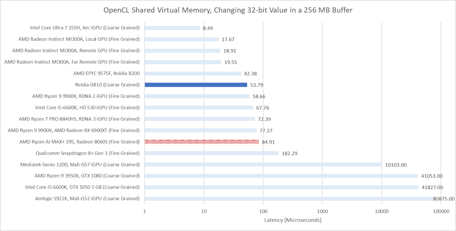Like many modern GPUs, GB10 supports OpenCL’s Shared Virtual Memory (SVM) feature. SVM allows seamless pointer sharing by mapping a buffer into the same virtual address space on both the CPU and GPU. GB10 supports “coarse grained” SVM, meaning the buffer cannot be simultaneously mapped on both the CPU and GPU. Some GPUs with only coarse grained SVM appear to copy the entire buffer under the hood, as can be seen with Qualcomm and Arm iGPUs. Thankfully, GB10 can handle this feature without requiring a full buffer copy under the hood.