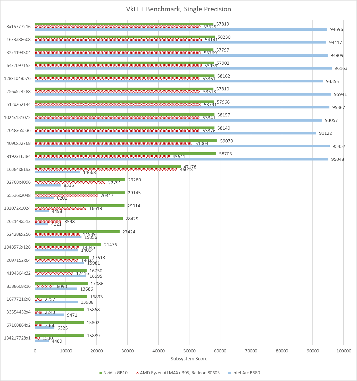 VkFFT implements Fast Fourier Transforms in multiple APIs. Here, I’m running its Vulkan benchmarks. GB10 leads Strix Halo, and turns in the most consistent performance across different test configurations. Strix Halo’s performance is more varied, and never beats GB10’s. Intel’s B580 is all over the place. It ends up with a higher average score than GB10, but takes huge losses in certain test configurations.