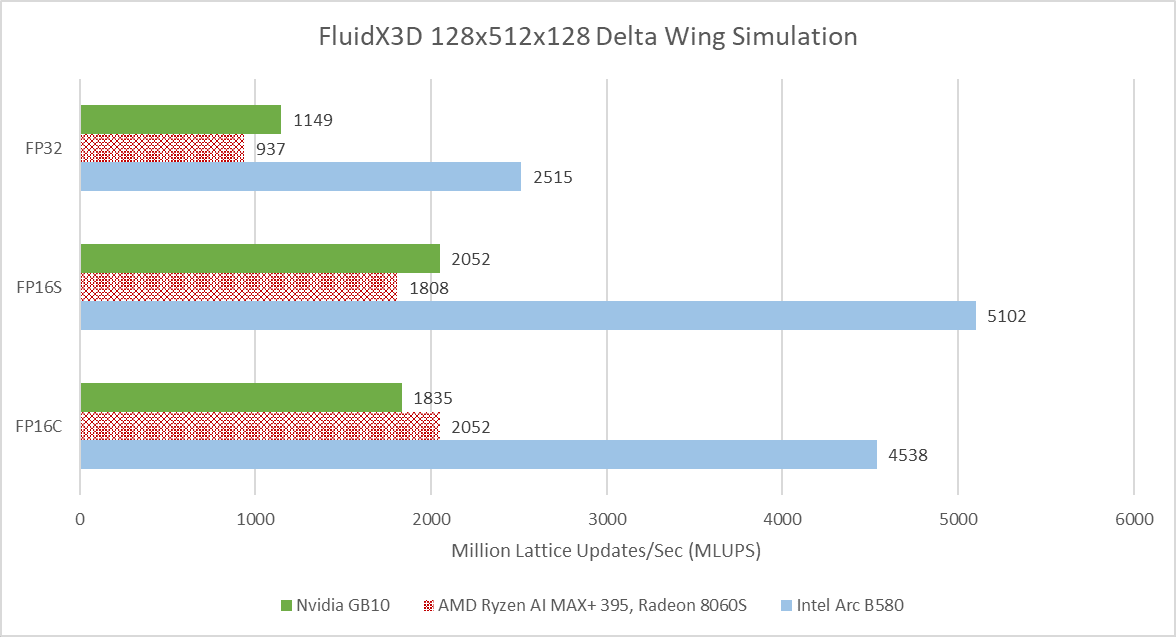 GB10 leads AMD’s Strix Halo when running FluidX3D’s delta wing simulation example with FP32, and continues to have an edge in FP16S. However, it falls behind in FP16C mode. Intel’s Arc B580 nominally sits in the same performance segment as Strix Halo, but manages a huge performance lead over both iGPUs. VRAM bandwidth is likely a factor. FluidX3D has poor memory access locality and therefore tends to be bound by VRAM bandwidth. Besides reporting simulation speed, FluidX3D outputs memory bandwidth figures that account for accesses made from its algorithm’s perspective.