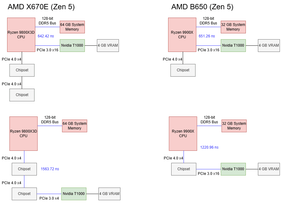 Chipsets today don’t take on performance critical roles, and accordingly aren’t optimized with low latency in mind. Going over chipset PCIe lanes adds hundreds of nanoseconds of latency, and imposes bandwidth restrictions. Chipsets can affect cache hit bandwidth too, possibly due to probe throughput constraints.