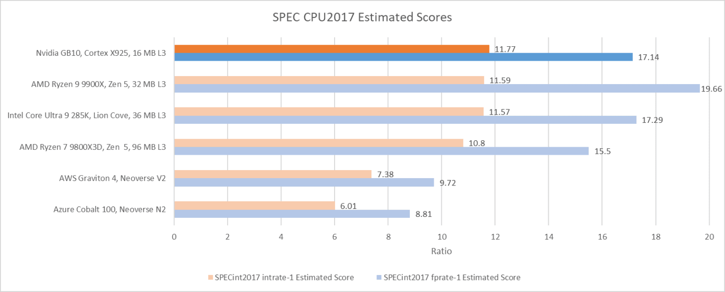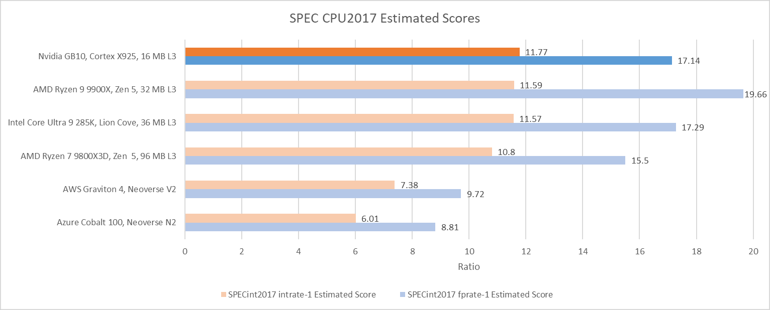 A725’s SPEC CPU2017 performance brackets Intel’s Crestmont as tested in their Meteor Lake mobile design. Neoverse N2 scores slightly higher. Core performance is heavily dependent on how it’s implemented, and low clock speeds in GB10’s implementation mean its A725 cores struggle to climb past older density optimized designs.
