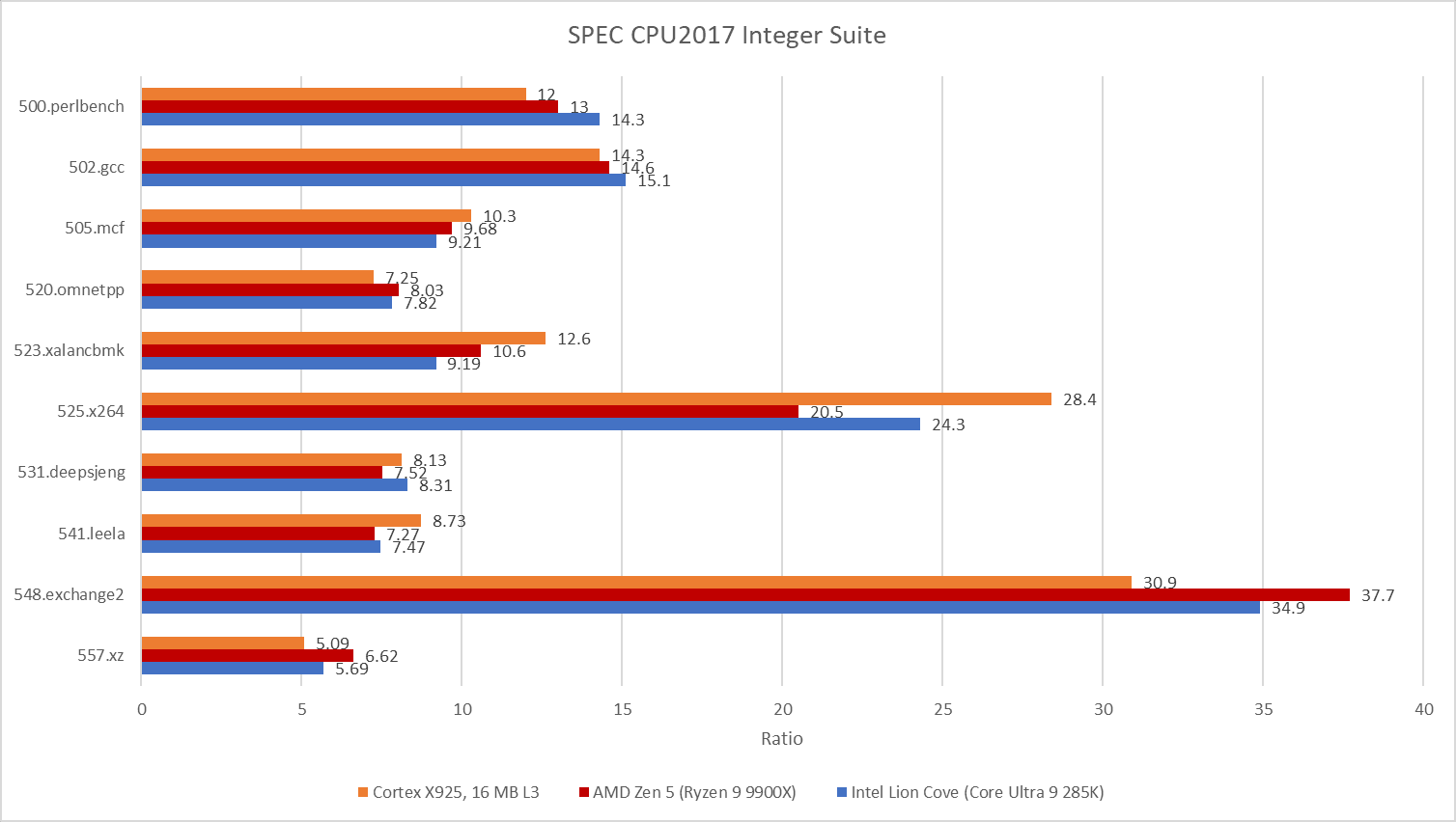 SPEC CPU2017’s floating point workloads throw a wrench into the works. Cortex X925 falls behind Zen 5 on enough tests to leave AMD’s latest and greatest core with a clear victory. In Arm’s favor, they are able to keep pace with Intel’s Lion Cove.