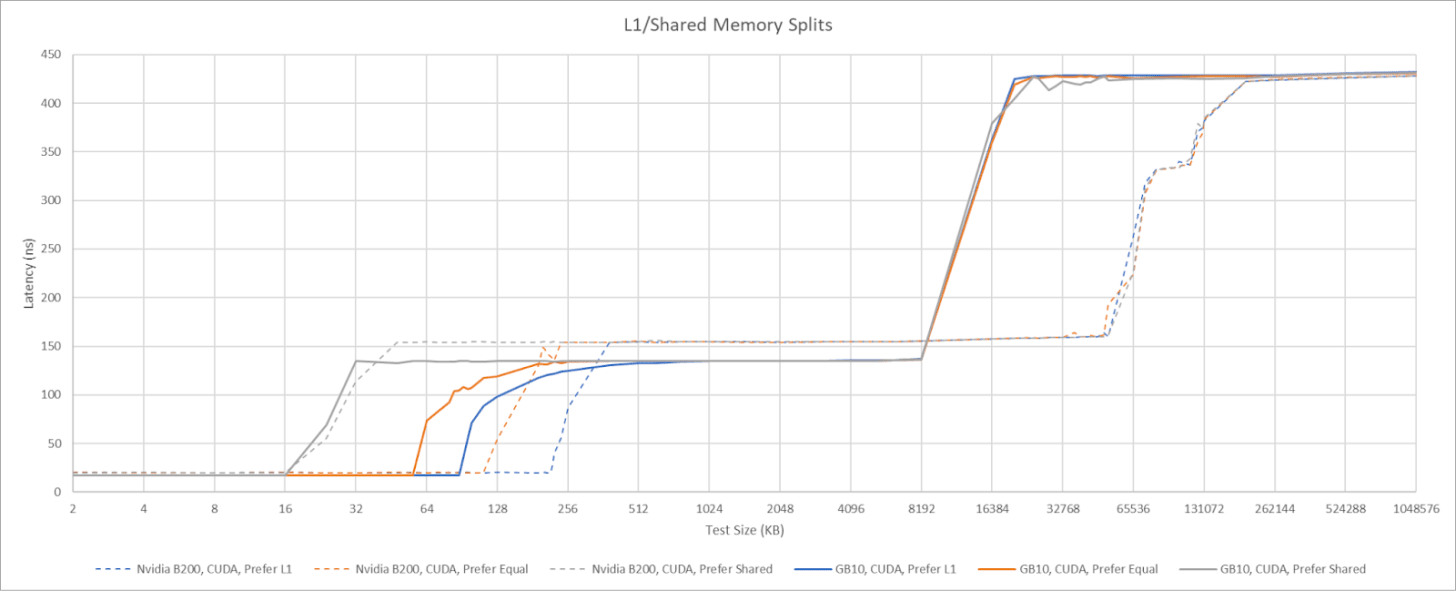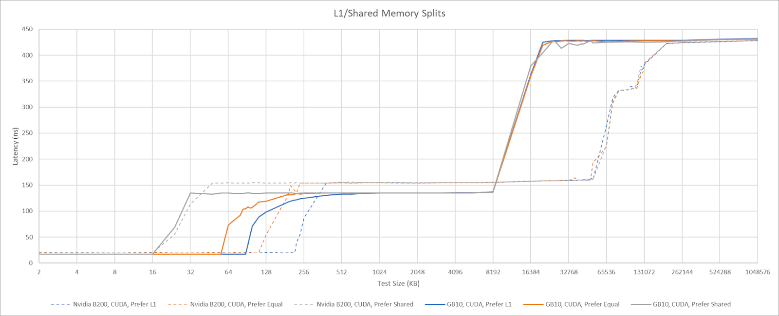 Instead, GB10 behaves much like Nvidia’s consumer Blackwell architecture and has 128 KB of L1/Shared Memory. In exchange for lower L1/Shared Memory capacity, GB10 achieves 13 ns of latency in Shared Memory using dependent array accesses. That’s slightly better than 14.84 ns for B200.