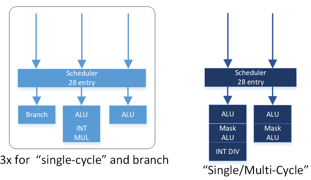 Thanks to symmetry across the integer schedulers, X925’s renamer likely uses a simple round-robin allocation scheme for operations that can go to multiple schedulers. If I test scheduler capacity by interleaving dependent and independent integer adds, X925 can only keep half as many dependent adds in flight. Following dependent adds by independent ones only slightly reduces measured scheduling capacity. That suggests the renamer assigns a scheduler for each pending operation, and stalls if the targeted scheduling queue is full without scanning other eligible schedulers for free entries.
