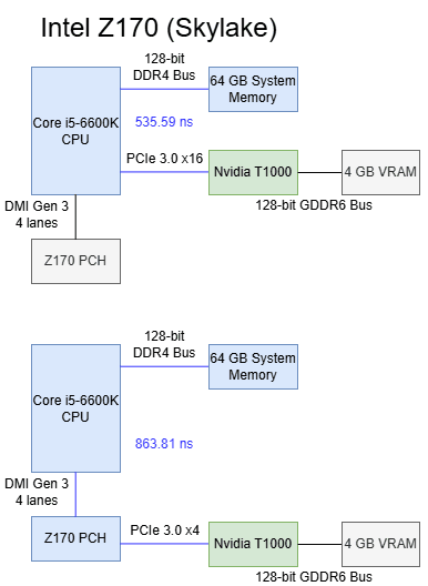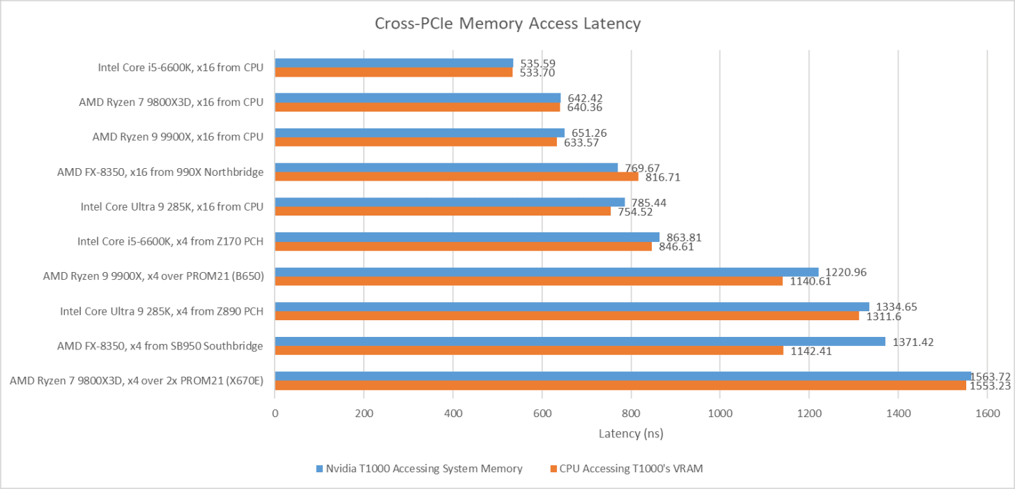 I’m using Nemes’s Vulkan-based GPU benchmark suite here, but with some modifications that let me allocate memory with the VK_MEMORY_PROPERTY_HOST_COHERENT_BIT set, and the VK_MEMORY_PROPERTY_DEVICE_LOCAL_BIT unset. That gives me a buffer allocated out of host memory. Then, I can run the Vulkan latency test against host memory, giving me GPU memory access latency over PCIe. The GPU in play doesn’t matter here, because I’m concerned with latency differences between using CPU PCIe slots and the southbridge ones. I’m using Nvidia’s T1000 because it’s a single slot card and can fit into the bottom PCIe slot in my various systems. All of the systems below run Windows 10, except for the FX-8350 system, which I have running Windows Server 2016. I’m using the latest drivers available for those operating systems, which would be 553.50 on Windows 10 and 475.14 on Windows Server 2016.