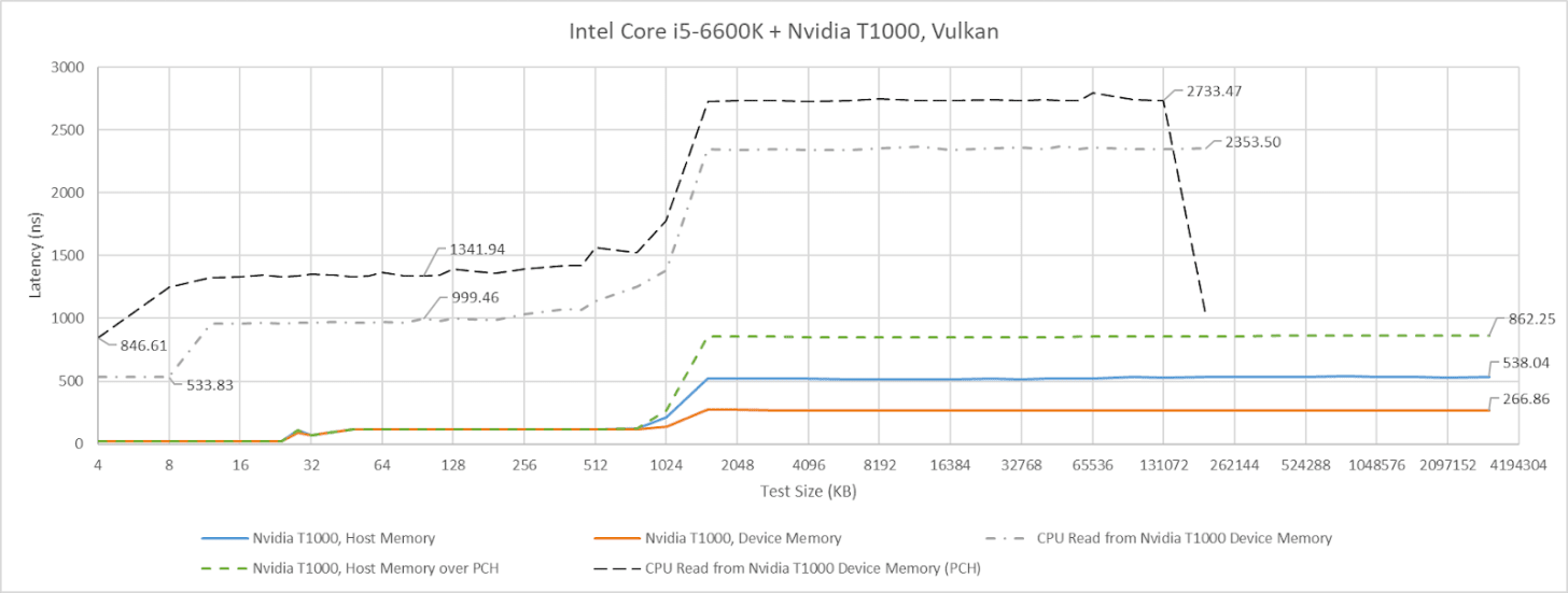I also tried testing in the other direction by having the CPU access GPU device memory. Nemes actually does that for her Vulkan uplink latency test. However, I hit unexplainable inflection points when testing across a range of test sizes. Windows performance metrics indicated a ton of page faults at larger test sizes, perhaps hinting at driver intervention. Investigating that is a rabbit hole I don’t want to go down, and the CPU to VRAM access behavior I observed with the T1000 didn’t apply in the same way across different GPUs. I’ll therefore be focusing on GPU to host memory access latency, though I’ll leave a footnote at the end for CPU-side results.