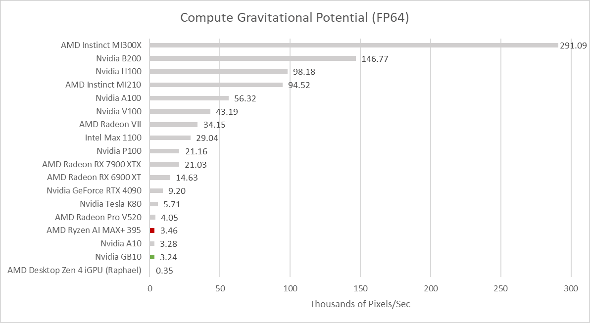 In this self-penned benchmark, I perform a brute-force gravitational potential calculation over column density values. It’s a GPU accelerated version of something I did during a high school internship. Datacenter GPUs tend to do very well because I use FP64 values. GB10 and Strix Halo fall very far behind.
